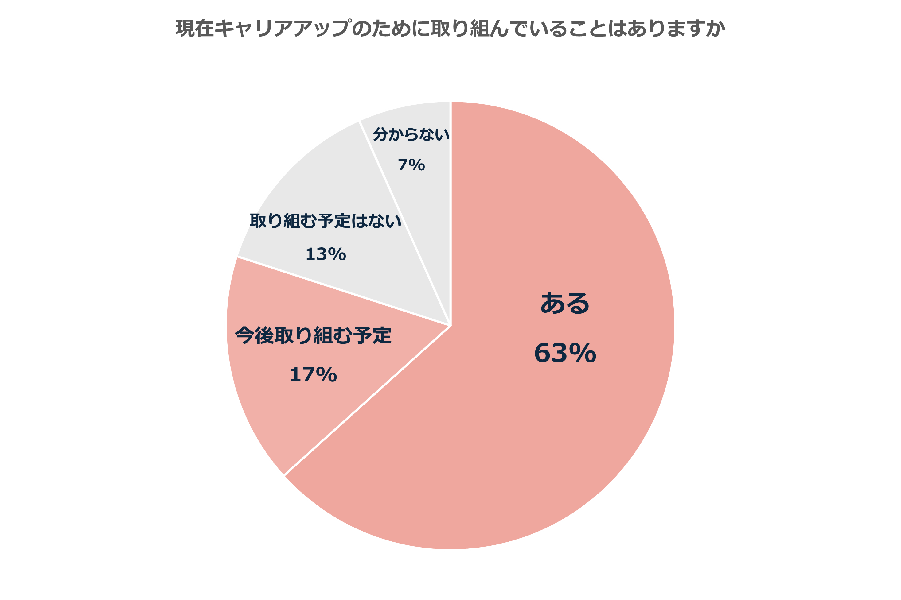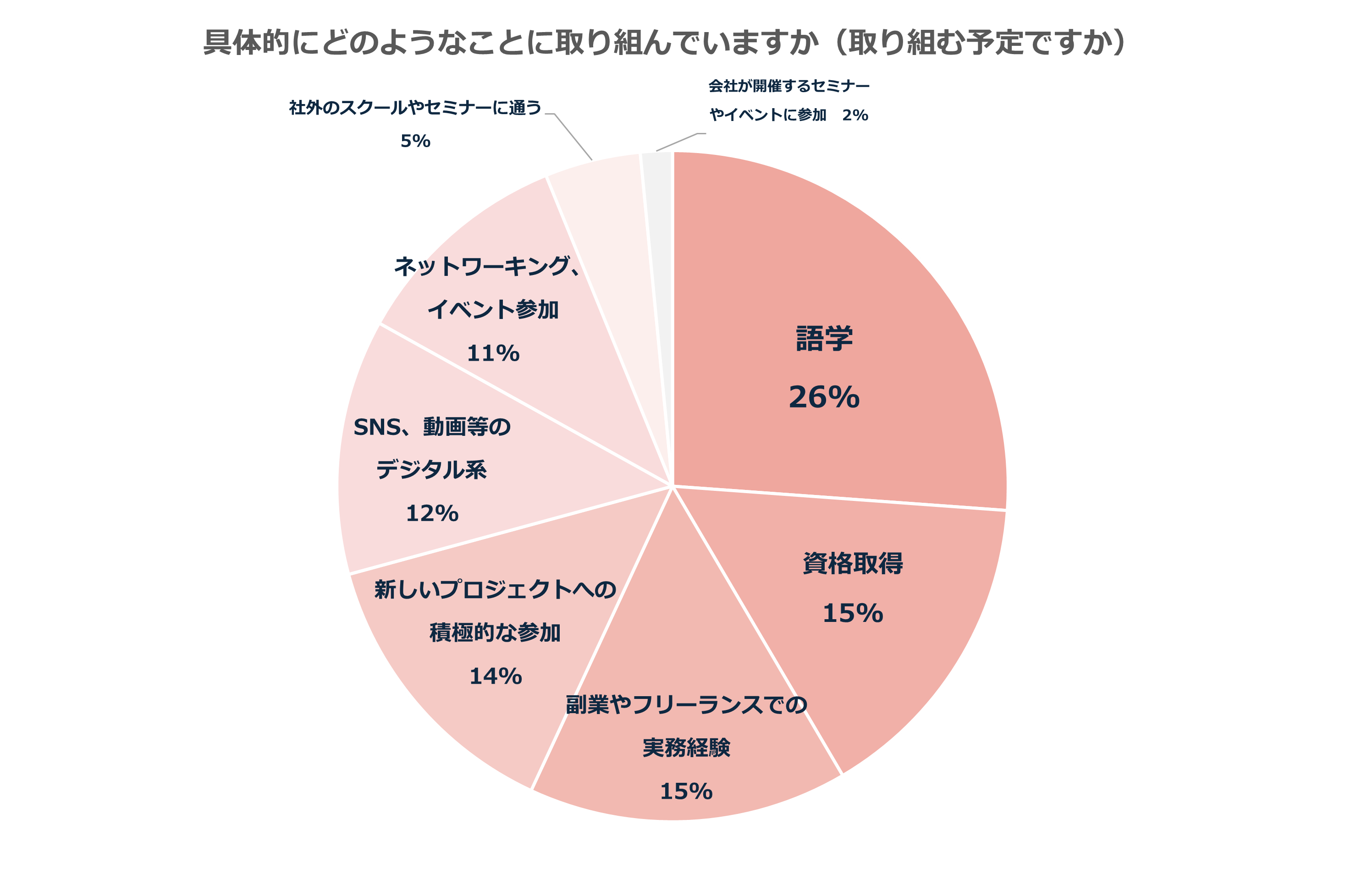また、キャリアアップのために具体的に取り組んでいること(取り組む予定)としては、「語学」(26%)、「資格取得」(15%)、「副業やフリーランスでの実務経験」(15%)と続き、現在の仕事に活かせるだけでなく、この先のキャリアに繋がることに幅広く取り組んでいることが分かります。