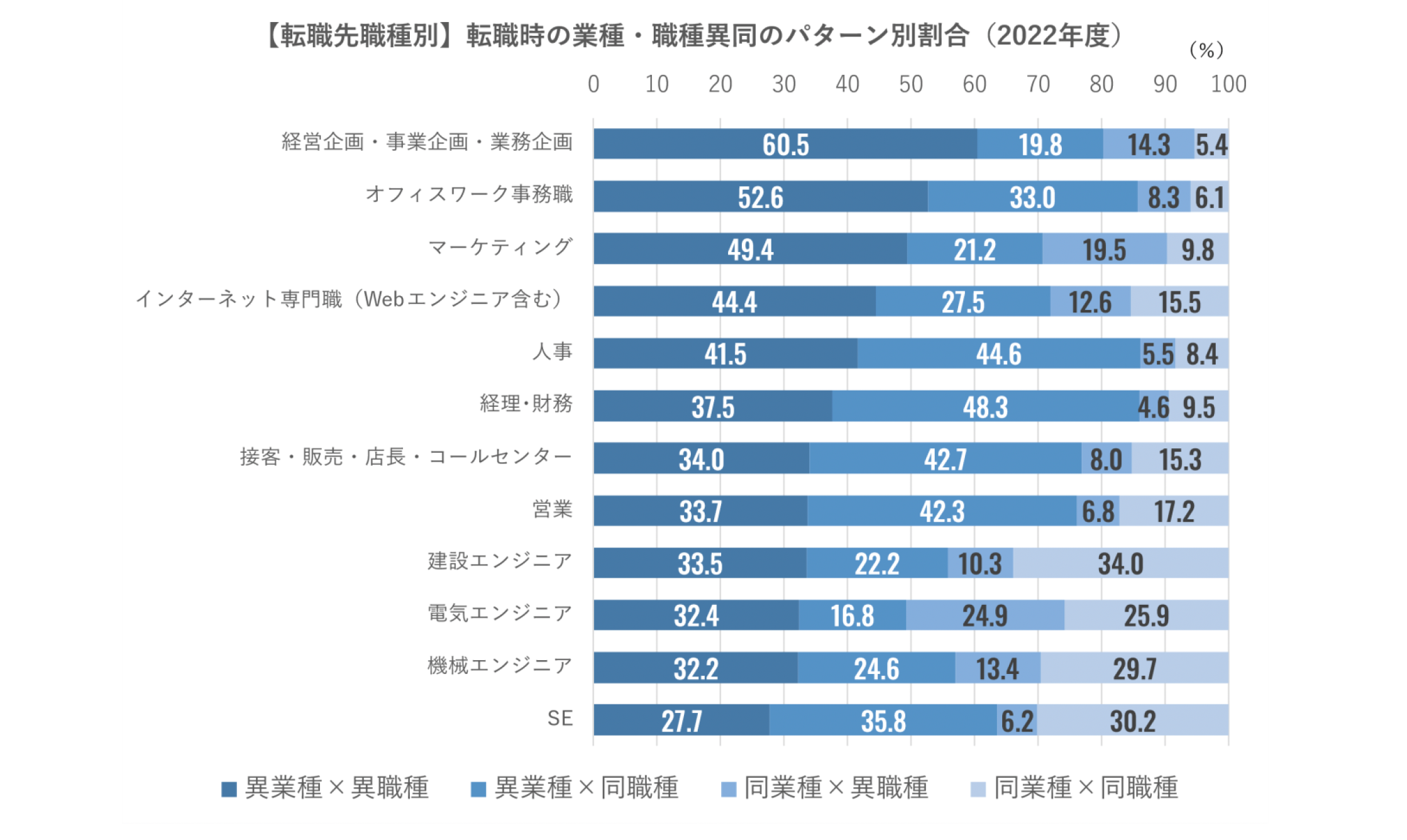 転職先の職種別に「異業種×異職種」の2022年度の状況を見ると、「経営企画・事業企画・業務企画(60.5%)」が特に高い割合を示しています。また、「オフィスワーク事務職(52.6%)」、「マーケティング(49.4%)」、「インターネット専門職(Webエンジニア含む)(44.4%)」もそれぞれ約半数が「異業種×異職種」の転職であることが分かります。一方で「建設エンジニア」「SE」「機械エンジニア」「電気エンジニア」といった技術系職種は、比較的「同業種×同職種」の割合が高く、それぞれ30%前後が「同業種×同職種」の転職であることを示しています。