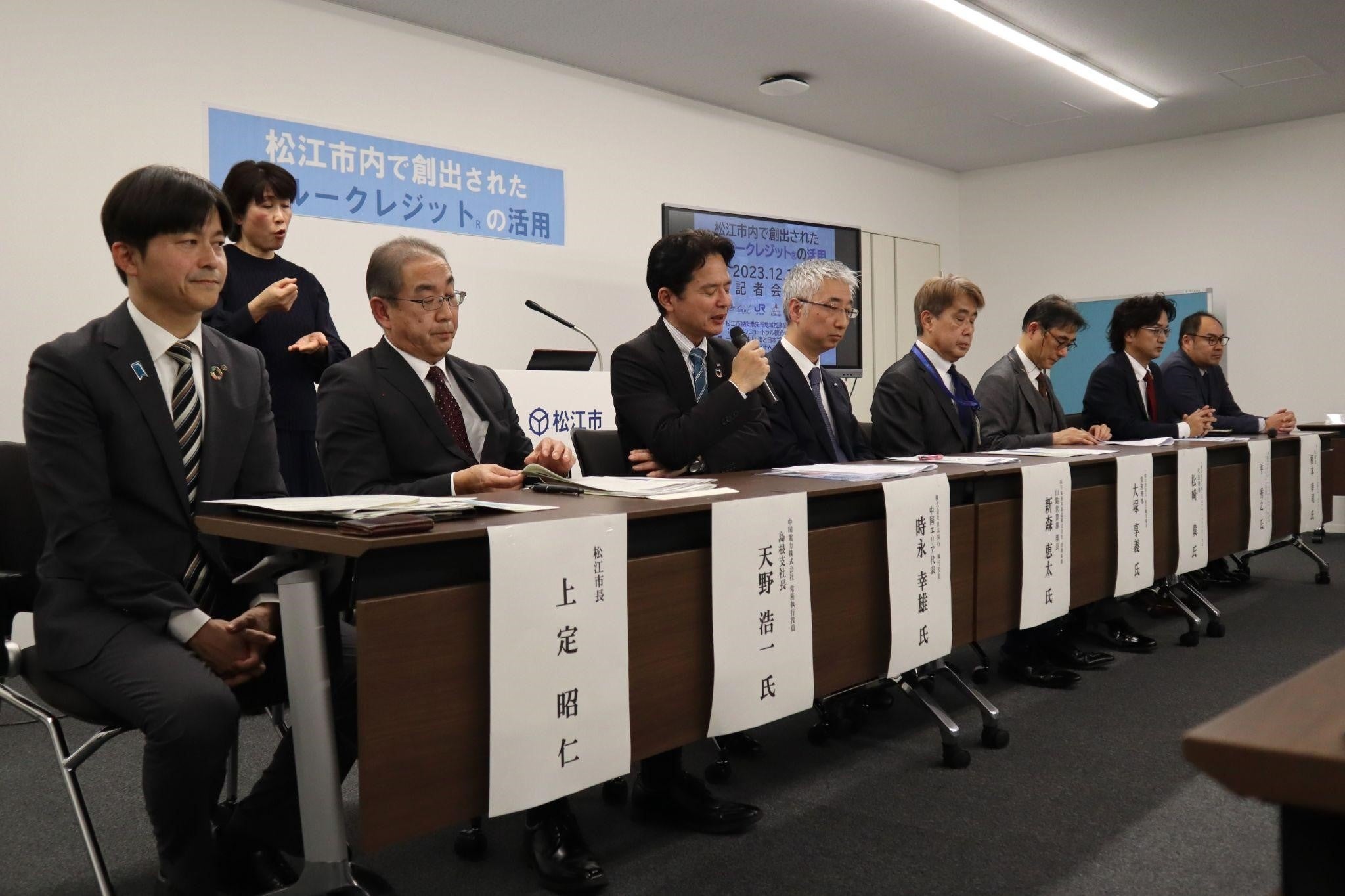 記者発表に出席した上定昭仁松江市長は、持続可能な社会を作るため、行政だけでなく市民が参加する取り組みを進めたいと話しています。同じく出席した一般社団法人 海と日本プロジェクト in しまね松崎貴代表理事は、海と日本プロジェクト in しまねとしても、松江市の脱酸素先行地域推進に貢献できる取り組みや活動を行っていきたいと話しました。