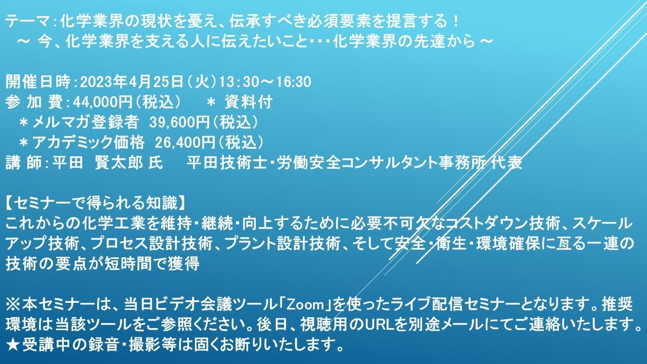 先端技術情報や市場情報を提供している(株)シーエムシー・リサーチ(千代田区神田錦町: https://cmcre.com/ )では、 各種材料・化学品などの市場動向・技術動向のセミナーや書籍発行を行っておりますが、 このたび「化学業界の現状を憂え、伝承すべき必須要素を提言する!~ 今、化学業界を支える人に伝えたいこと・・・化学業界の先達から ~」と題するセミナーを、 講師に平田 賢太郎 氏 (平田技術士・労働安全コンサルタント事務所 代表)をお迎えし、2023年4月25日(火)13:30より、 ZOOMを利用したライブ配信で開催いたします。 受講料は、 一般:44,000円(税込)、 弊社メルマガ会員:39,600円(税込)、 アカデミック価格は26,400円(税込)となっております(資料付)。
