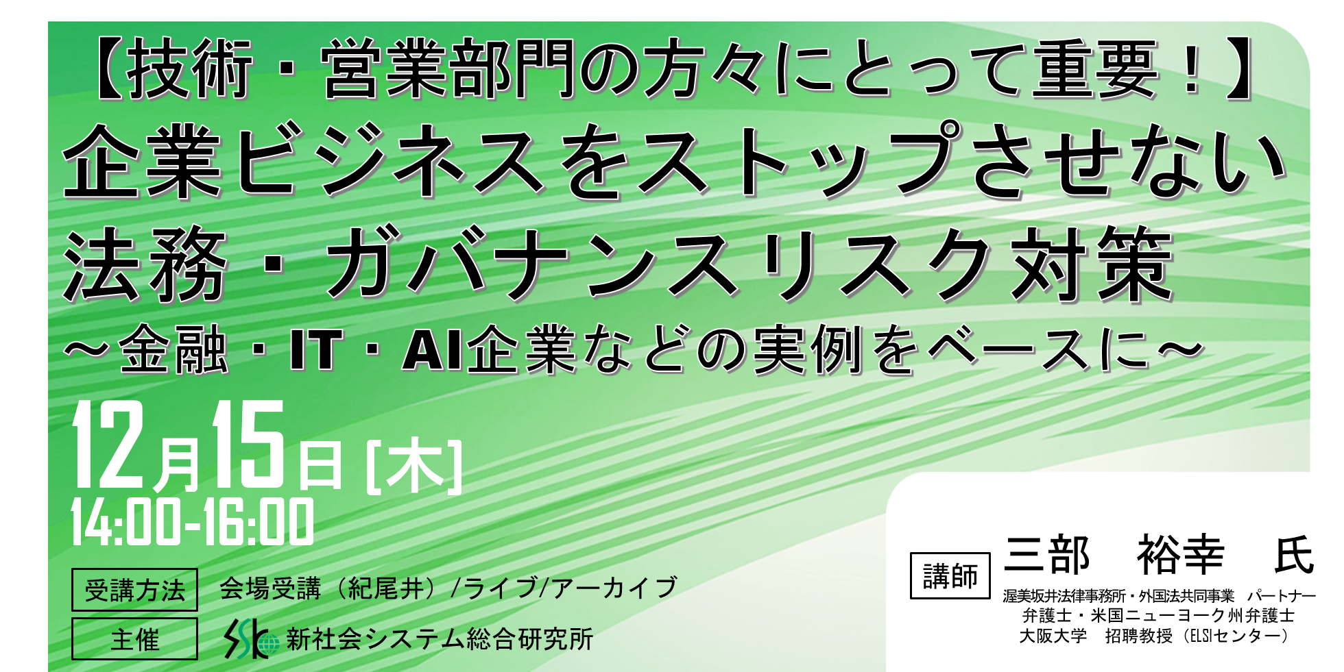「企業ビジネスをストップさせない法務・ガバナンスリスク対策」と題して渥美坂井法律事務所・外国法共同事業 パートナー 三部 裕幸氏によるセミナーを2022年12月15日(木)に開催!!