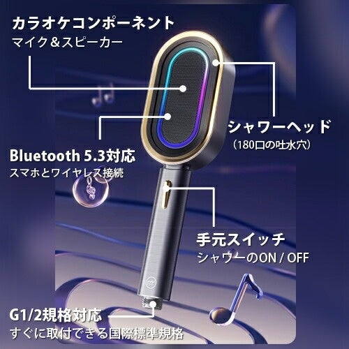 本体はシャワーヘッドと脱着可能なカラオケコンポーネント(マイク内蔵スピーカー)で構成。