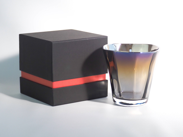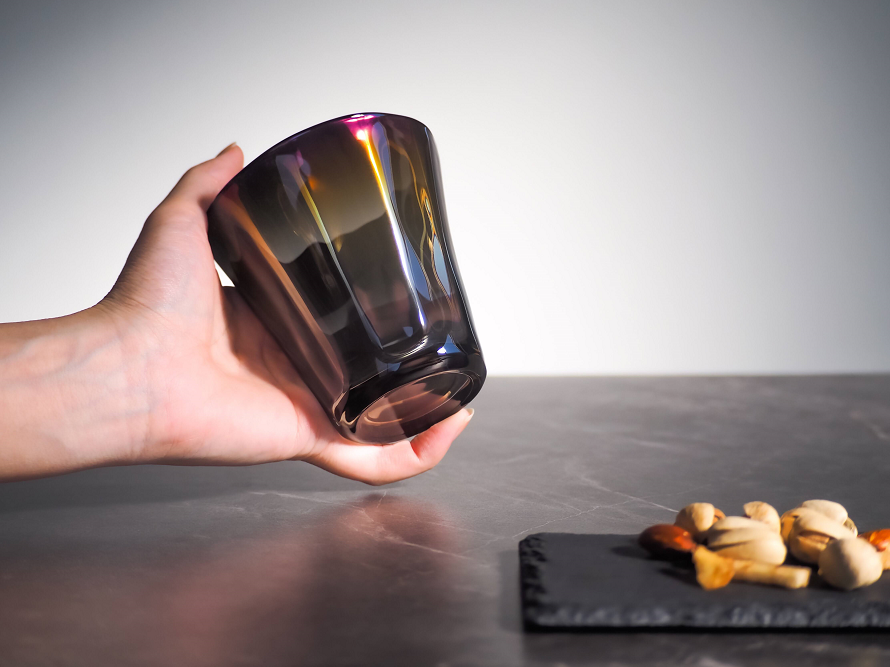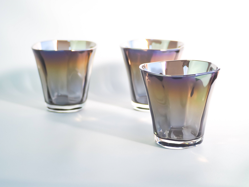 商品紹介 :『JEWERLY GLASS』 :PROGRESSの持つ宇宙開発技術を応用したチタン加工技術によりガラスのグラスをコーティング。見る角度により色合いの変化を楽しめるほか、経年変化を防ぐことで衛生面でも優れている商品となります。