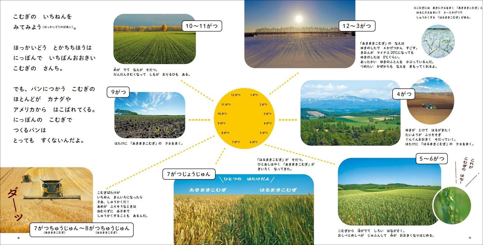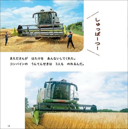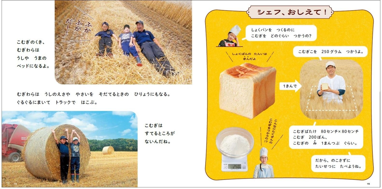 小麦粉は見たことがあっても、小麦はどんなふうに生えて、育つのか、知らない子どもたちも多くいます。この本では、地元の子どもたちが実際に小麦畑に行ってコンバインで収穫体験したり、麦わらに寝そべったりして、原料と触れ合います。