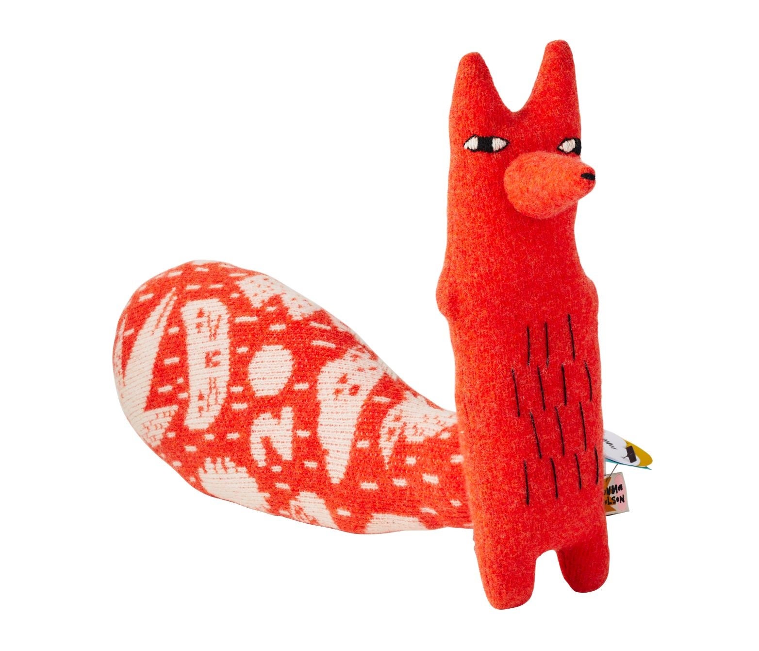 スコットランドに生まれたドナ・ウィルソンは、ロイヤル・カレッジ・オブ・アート(英国王立芸術大学院)で学んでいた時に初めてニットの縫いぐるみを生み出して以来、フィギュア、アパレルなど創作活動の幅を広げ、世界に発信しています。写真のシリル・スクイレル・フォックスは制作活動20周年記念作品として、しっぽにこれまでのアイコン的モチーフをあしらっており、手作りのため1点ずつ表情などが異なります。