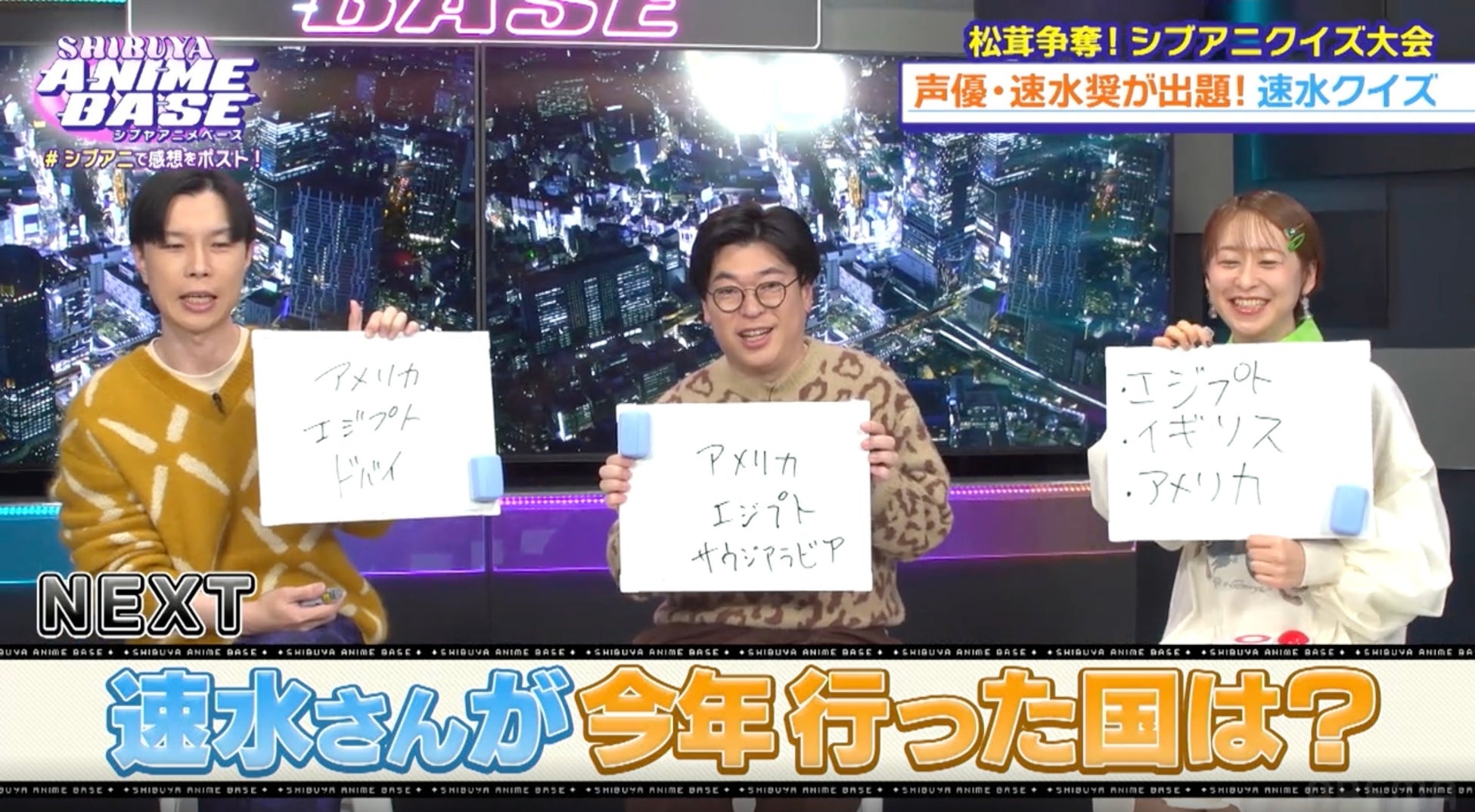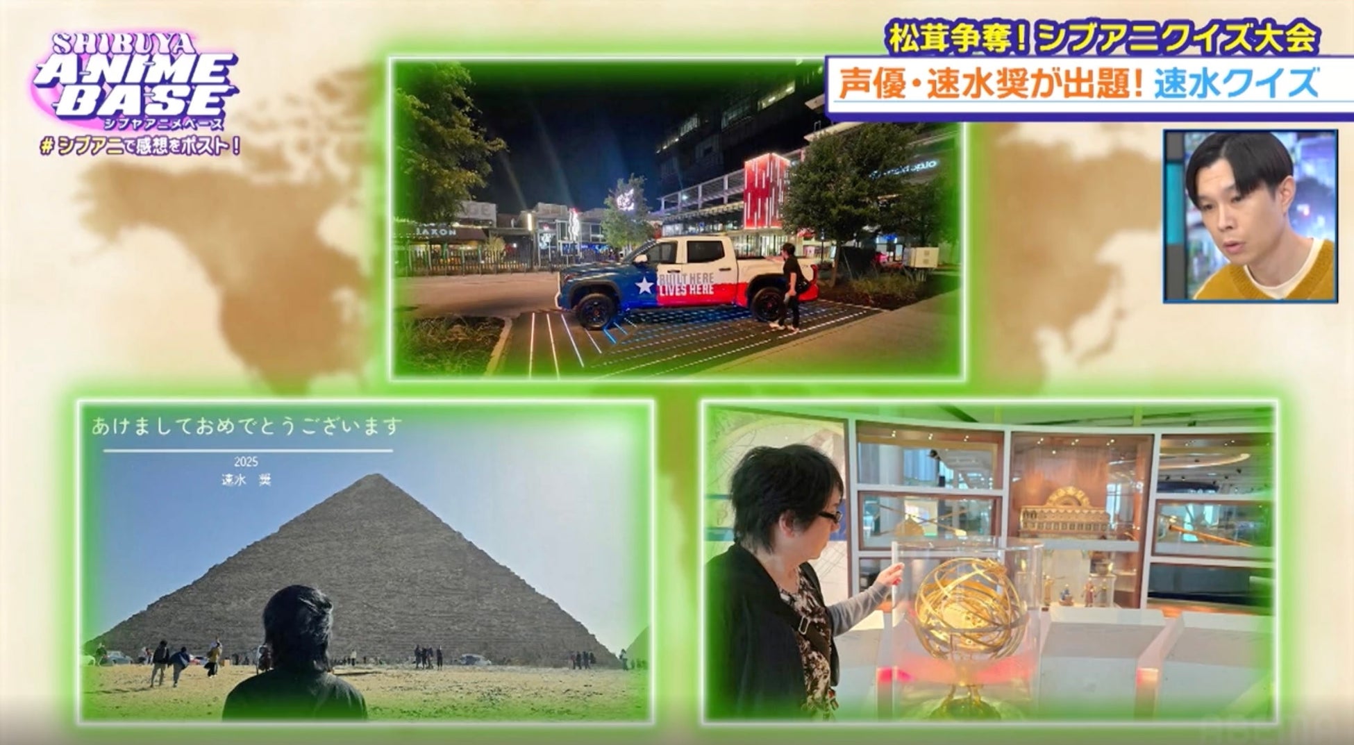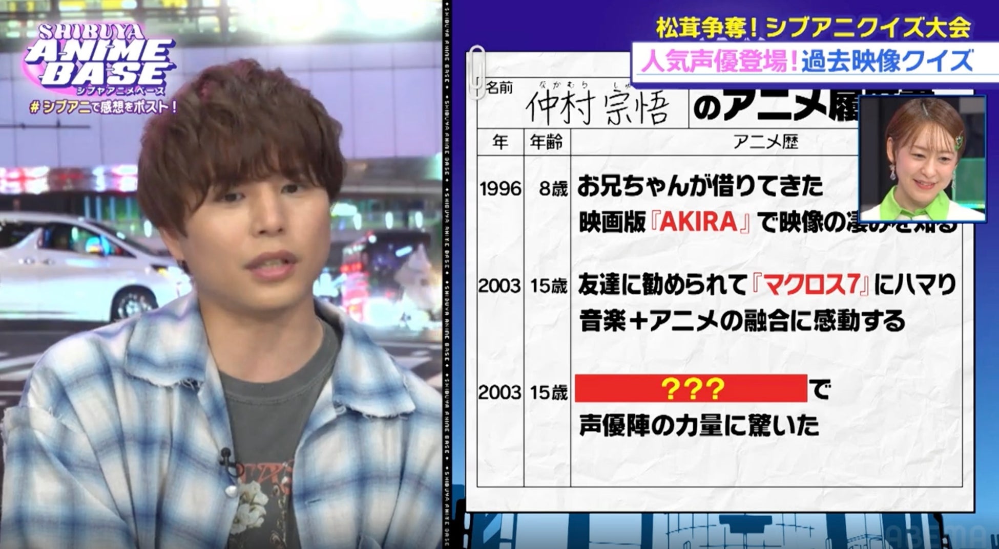続く「『シブアニ』過去映像クイズ」では、ゲストの天津が不利になるため進行役・仲村宗悟が仲間として参戦。早押しクイズ第1問目は2025年6月13日放送のゲスト・上坂すみれさんが「私の推しながき」のコーナーにて推しについて「彼の最大の特徴はコスプレに頼っていないところ、裸をテーマにしたキャラ」と発言。上坂さんの推しは?との出題に、仲村はすかさず「ポムポムプリン!」と回答し、スタジオからは「そうだ!」との声があがります。ほかにも、2025年5月2日の放送で、レギュラーメンバーとして加入した仲村のアニメ履歴書のコーナーからも出題が。「仲村さんが15歳のときにハマった作品は?」との問題に、ハライチ・岩井は「カウボーイビバップ」と即答し、仲村からは「覚えてるじゃないですか!」と嬉しそうなコメントが飛び出しました。