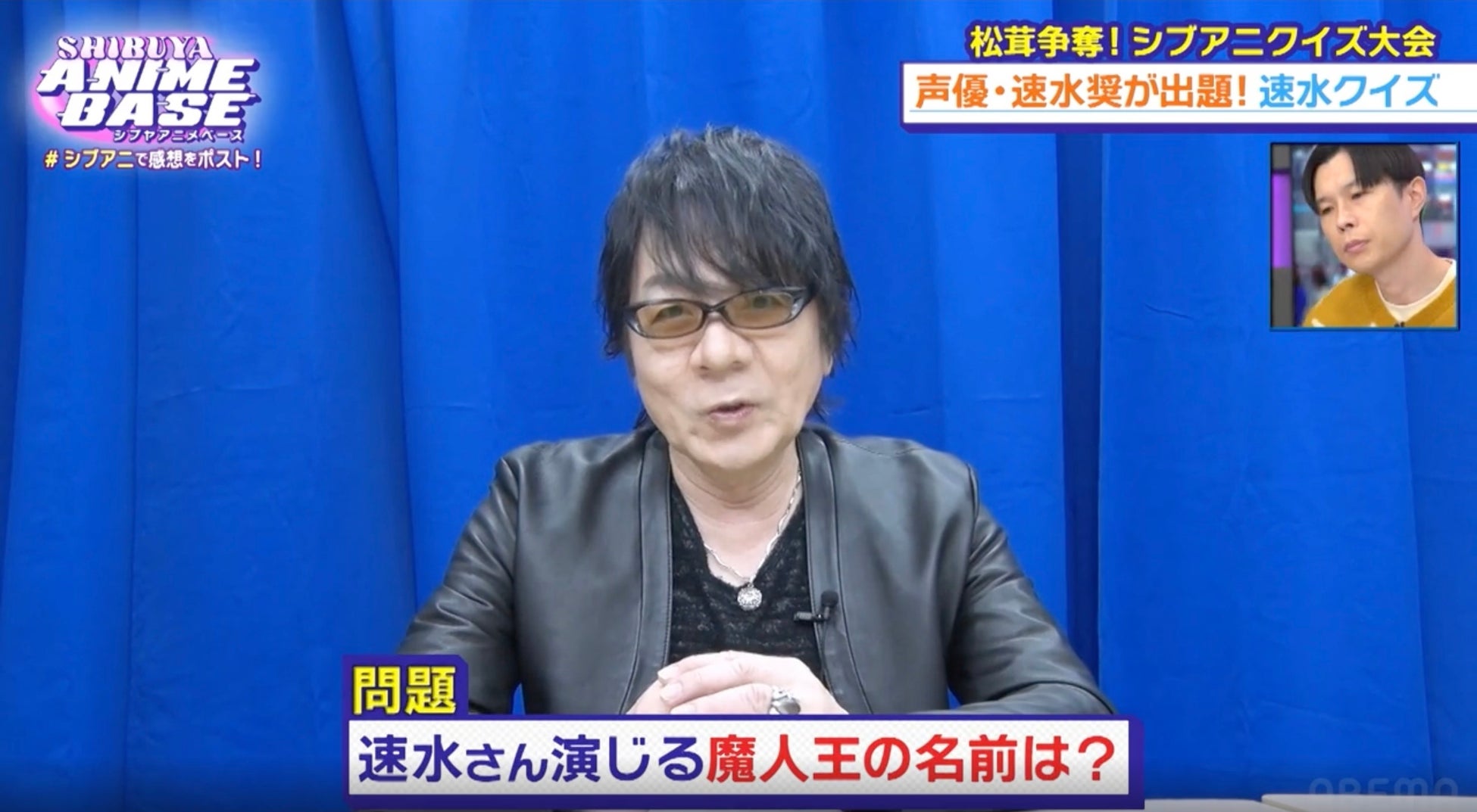 ここで、声優・速水奨さんが出題者としてVTRで登場。現在放送中のアニメ『野生のラスボスが現れた!』に出演中の速水は、「僕の演じる魔神王の名前は?」とイケメンボイスで出題します。熟考の末、徳井は「ショウ」、天津は「オーグ」、ハライチ・岩井は「ゴウル」と回答。正解は「オルム」で速水は「アニメ見てくださいね」と呼びかけます。