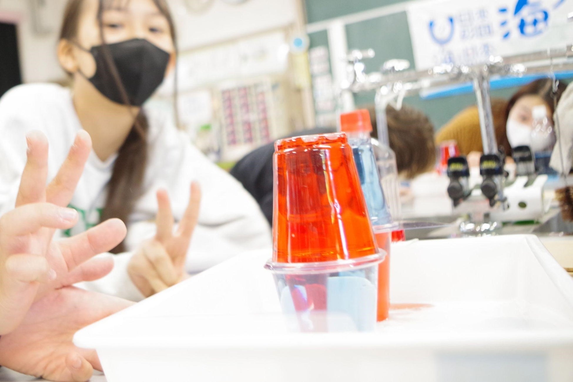 実験の一コマ。温度の違う色水の混ざり方の違いで、暖流と寒流の違いについて学びました。
