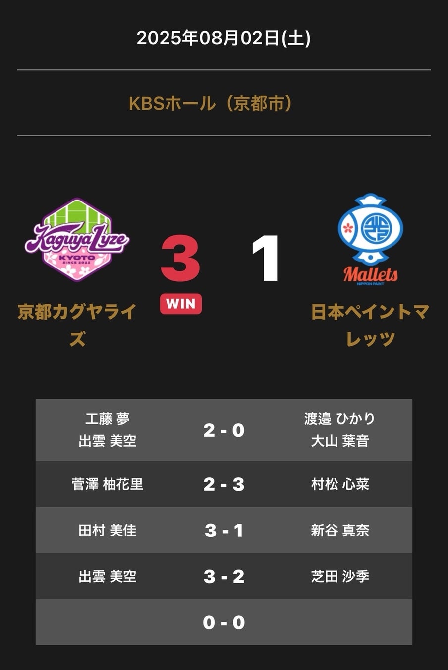ノジマTリーグ 2025-2026 公式戦 8月2日開催 「京都カグヤライズ vs 日本ペイントマレッツ」の試合は3-1で京都カグヤライズが勝利しました。