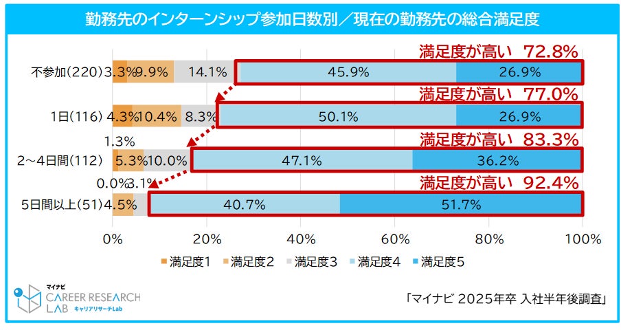◆「就活時の入社予定先満足度」は前年よりも高い一方、「入社後の勤務先満足度」は前年よりも低い傾向。現在の勤務先の「5日間以上」のインターンシップ参加者は、満足度が高い傾向に