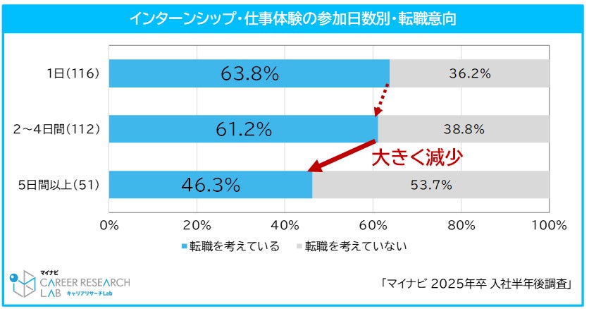 ◆新入社員の転職意向は約6割で、前年より増加。「5日間以上」のインターンシップ・仕事体験参加の場合、転職意向は半数以下に