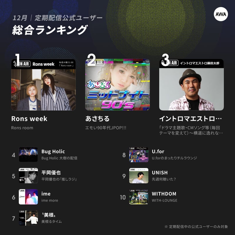 AWA株式会社(本社:東京都港区、代表取締役CEO:冨樫晃己)が運営する、サブスクリプション型(定額制)音楽ストリーミングサービス「AWA(アワ)」は、2022年12月1日(木)から12月31日(土)までに開催された、音声ライブ配信を利用した「定期配信ラウンジ」※の視聴数、開催頻度、リアクション数などを総合して、2022年12月の定期配信AWAラウンジランキングTOP10を発表いたしました。