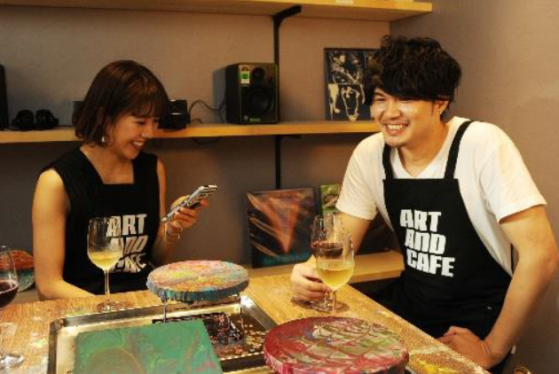 「ART AND CAFE」(4ページ参照)でワインを片手にアートを楽しむ様子