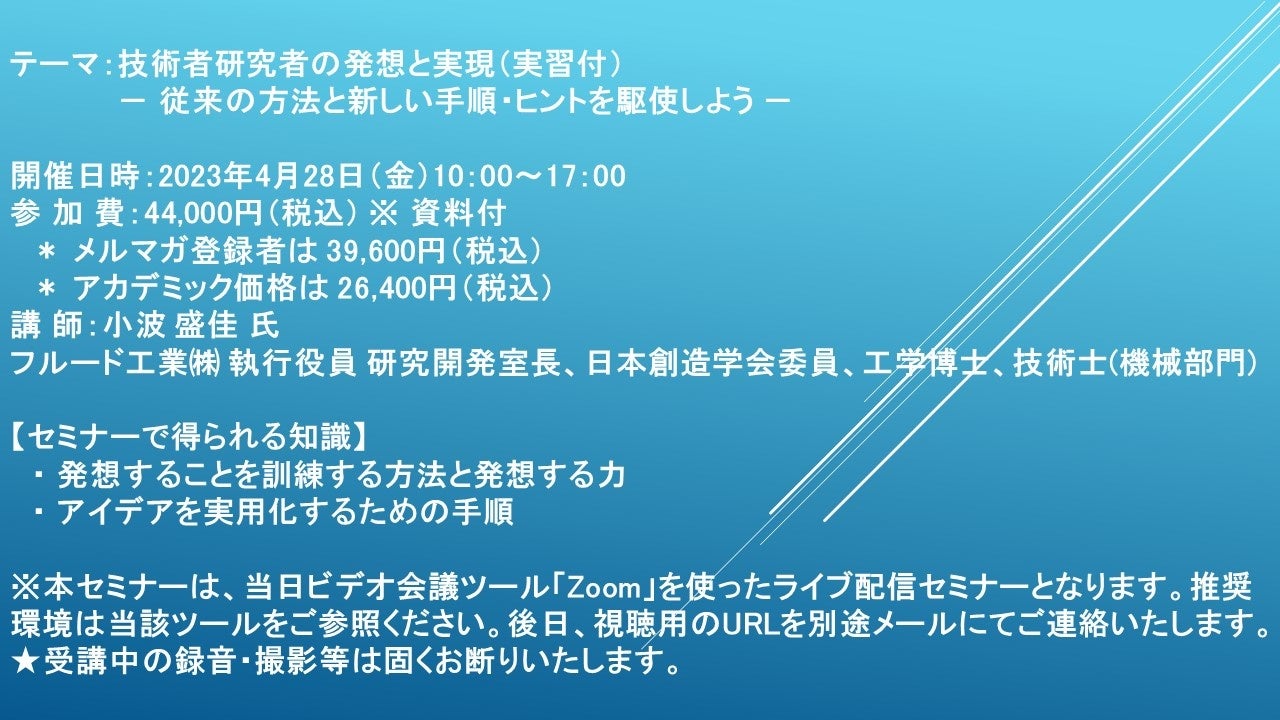 先端技術情報や市場情報を提供している(株)シーエムシー・リサーチ(千代田区神田錦町: https://cmcre.com/ )では、 各種材料・化学品などの市場動向・技術動向のセミナーや書籍発行を行っておりますが、 このたび「技術者研究者の発想と実現(実習付)- 従来の方法と新しい手順・ヒントを駆使しよう -」と題するセミナーを、 講師に小波 盛佳 氏 (フルード工業(株) 執行役員 研究開発室長、日本創造学会委員、工学博士、技術士(機械部門))をお迎えし、2023年4月28日(金)10:00より、 ZOOMを利用したライブ配信で開催いたします。 受講料は、 一般:44,000円(税込)、 弊社メルマガ会員:39,600円(税込)、 アカデミック価格は26,400円(税込)となっております(資料付)。