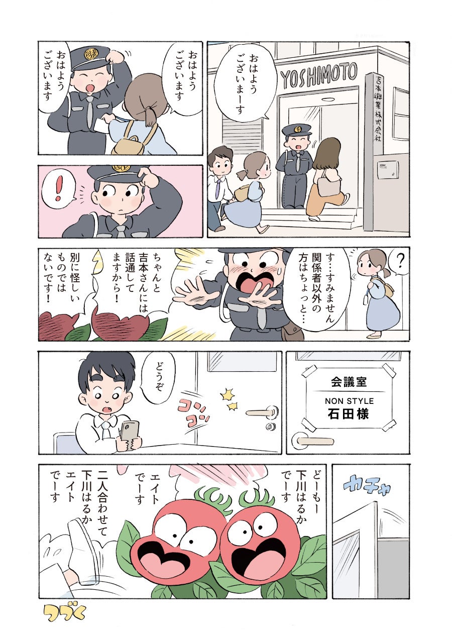 ■ 第2弾:トマト漫才師「下川はるかエイト~NON STYLE石田の弟子になる」 漫画NON STYLE石田明が原案のストーリーは、トマトの妖精「はるか」と「エイト」が、NON STYLE石田明に弟子入りし、M-1グランプリを目指します。さらに彼らをスターにしようと奮闘する下川町の職員も登場。トマト・職員・芸人という異色な組み合わせの5人が、M-1を目指すドタバタコメディ漫画。