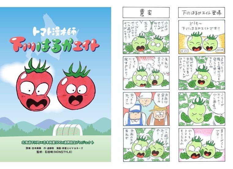 下川町の実在するフルーツトマト「はるかエイト」が、“トマト漫才師・下川はるかエイト”として4コマ漫画化!下川町で栽培されるフルーツトマト「はるか」と「エイト」が、駆け出しの漫才師として、リズムの良い漫才の掛け合いに乗せ、時事ネタやトマト栽培あるあるに触れ、真っ赤に熟れる(売れる)ことを夢見るストーリー。ストーリー監修は、NON STYLE石田明が務めている。