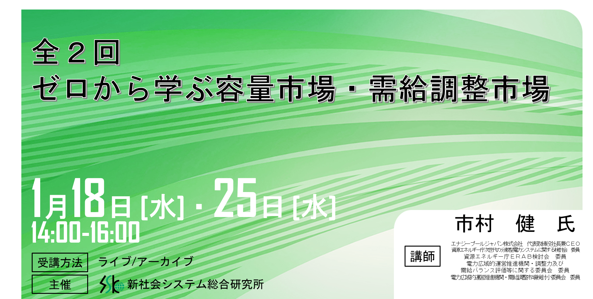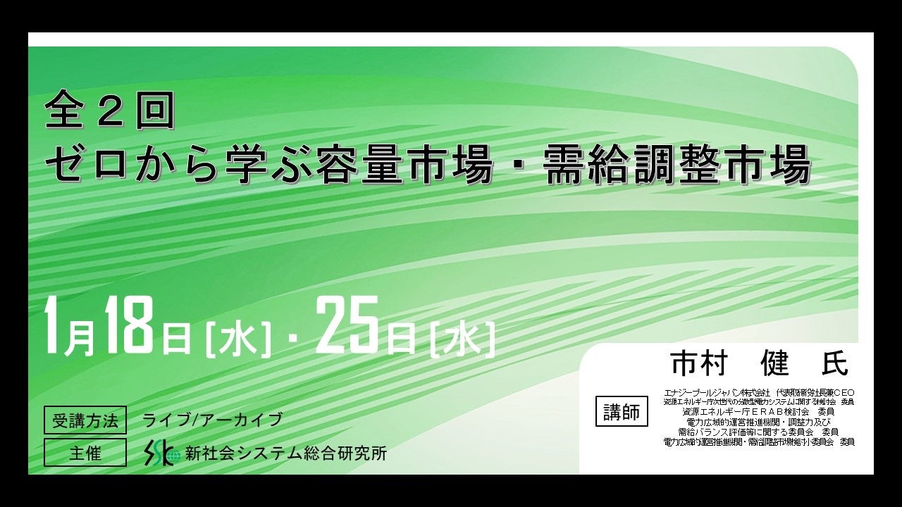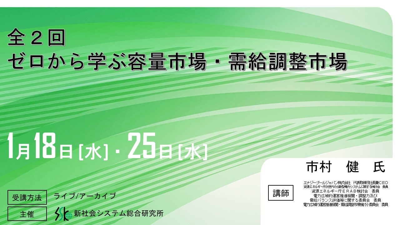 「全2回 ゼロから学ぶ容量市場・需給調整市場」と題してエナジープールジャパン株式会社 代表取締役社長兼CEO 市村 健氏のセミナーを2023年1月18日・25日(水)に開催!!