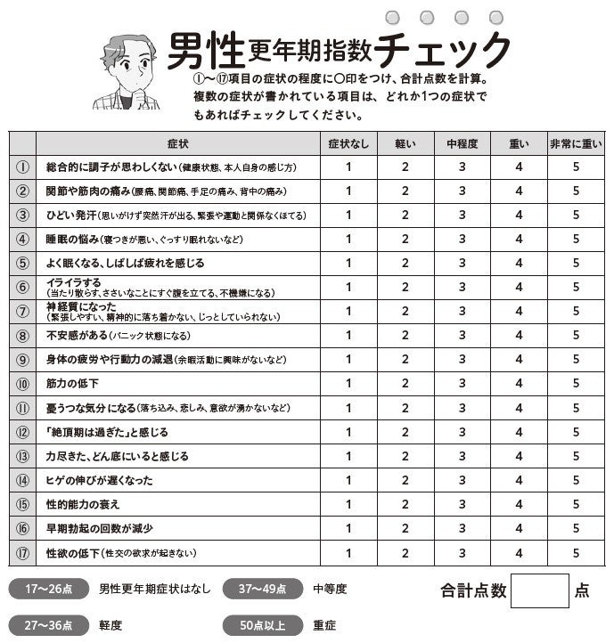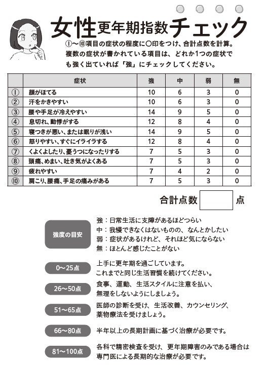 更年期症状が気になる方にまず確認してもらいたいのは、書籍に掲載している「男女別・更年期指数チェック」です。更年期症状のレベルを客観的に確認する診断ツールで、医療機関でも問診や治療の効果判定にも使われています。数カ月に1回のチェックで、治療やセルフケアの効果が上がっているかを確認することもできます。