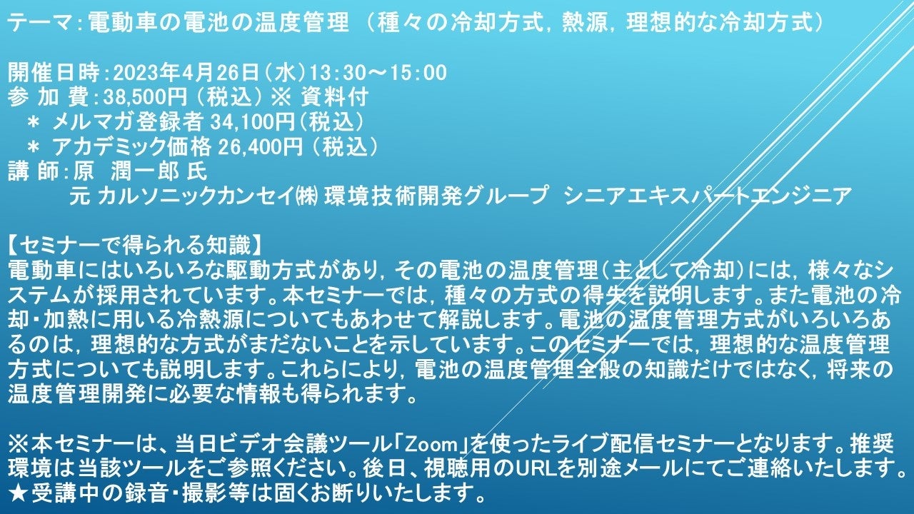 先端技術情報や市場情報を提供している(株)シーエムシー・リサーチ(千代田区神田錦町: https://cmcre.com/ )では、 各種材料・化学品などの市場動向・技術動向のセミナーや書籍発行を行っておりますが、 このたび「電動車の電池の温度管理 (種々の冷却方式,熱源,理想的な冷却方式)」と題するセミナーを、 講師に原 潤一郎 氏 (元 カルソニックカンセイ(株) 環境技術開発グループ シニアエキスパートエンジニア)をお迎えし、2023年4月26日(水)13:30より、 ZOOMを利用したライブ配信で開催いたします。 受講料は、 一般:38,500円 (税込)、 弊社メルマガ会員:34,100円(税込)、 アカデミック価格は26,400円(税込)となっております(資料付)。