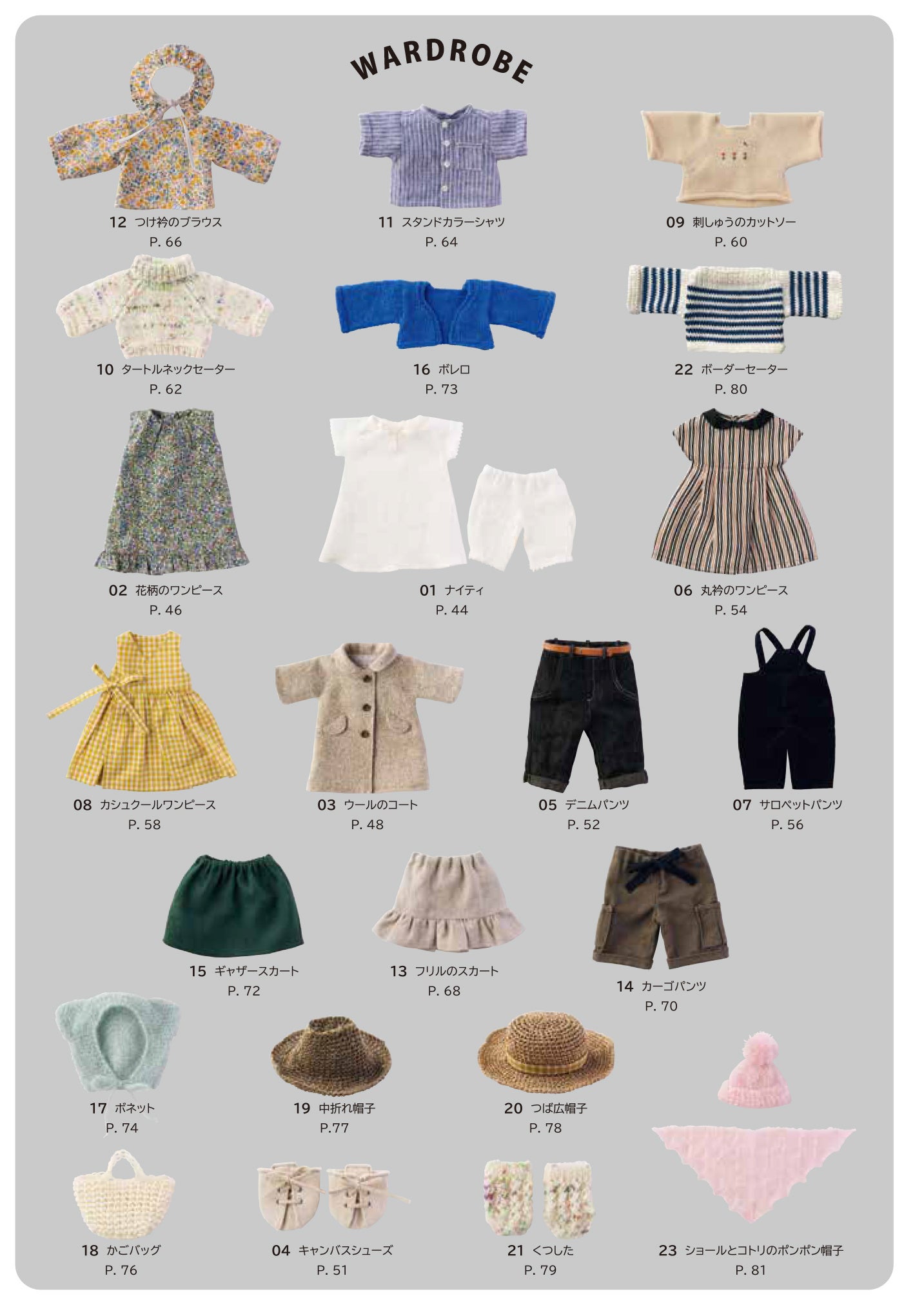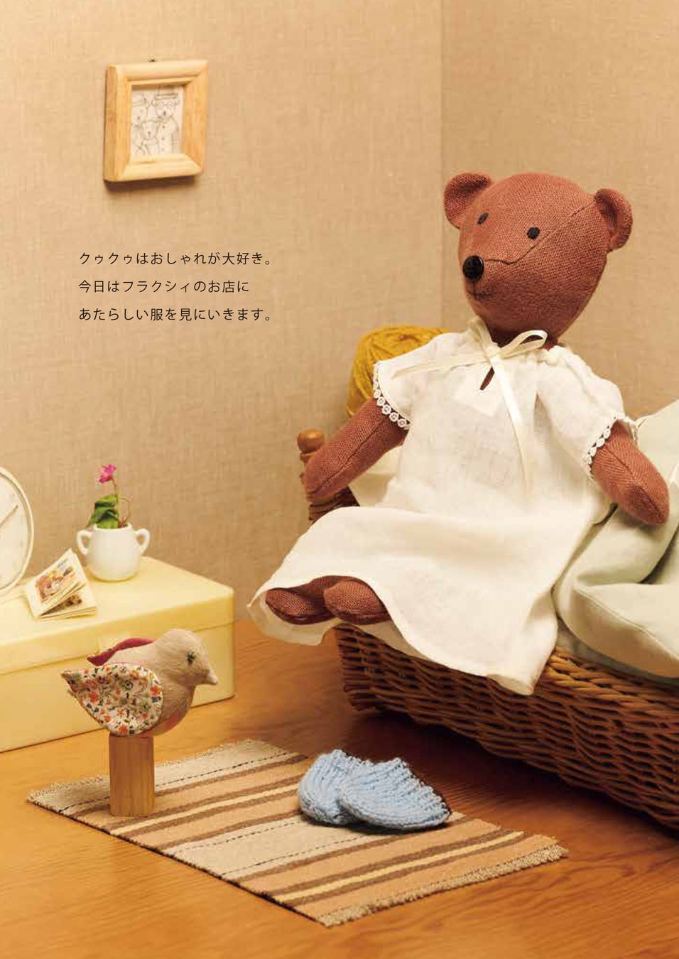 物語に登場する3体のぬいぐるみはもちろん、洋服や小物25点の作り方、編み方も載っているので、実際に作って、編んで、着せ替え遊びをすることができます。