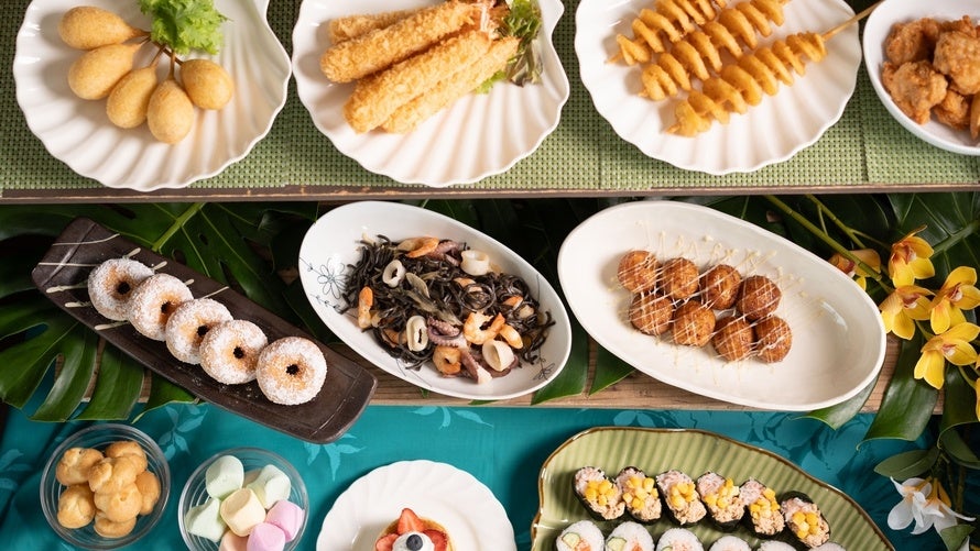 ・チョコレートファウンテン・シェイブアイス・綿菓子・ツイストポテト・海賊焼きそば・パンケーキ・マラサダ・太巻き マヨ軍艦 いなり寿司