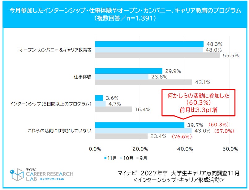 11月のキャリア形成活動参加率は60.3%で、前月より3.3pt増。27年卒予定の大学生は「流動性の高い雇用」よりも「終身雇用」を希望
