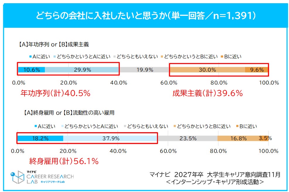 評価方法に関しては、「年功序列」か「成果主義」のどちらの制度がある会社に入社をしたいか聞くと、「年功序列(40.5%)」、「成果主義(39.6%)」となり、ほぼ同じ割合となった。