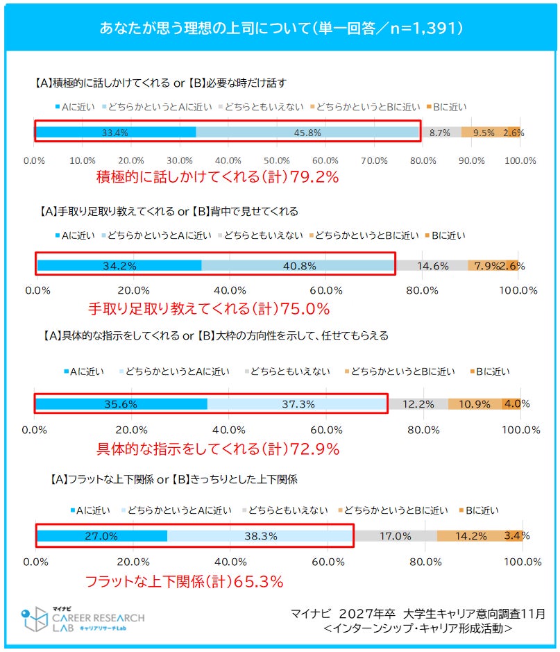 今回の調査から、理想の上司像として「積極的なコミュニケーション」「丁寧な指導」「具体的な指示」「フラットな関係性」を求める傾向が明らかになりました。