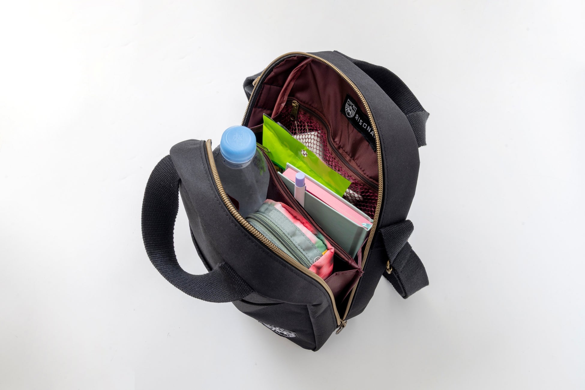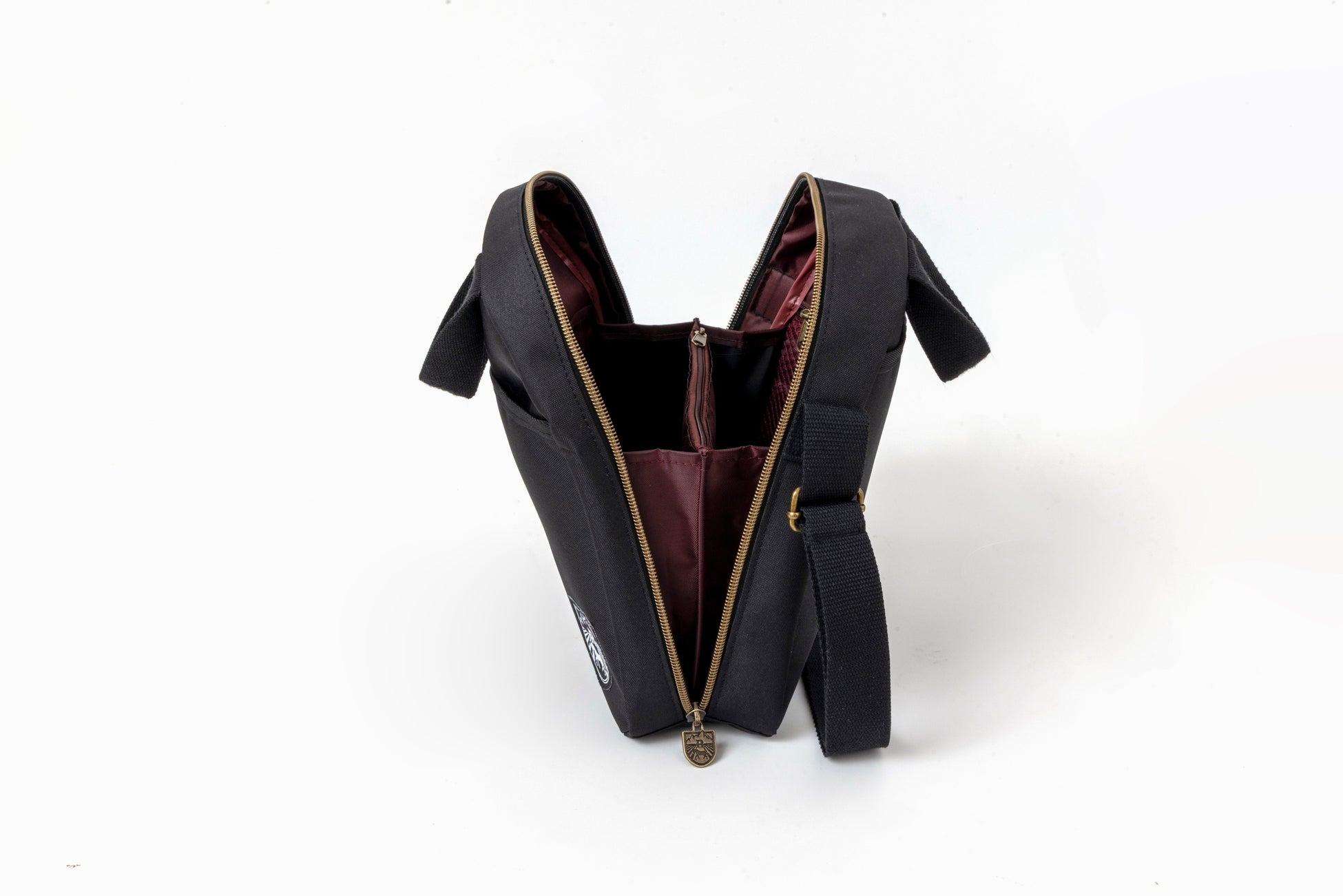 リゾナーレのロゴ入りショルダーバッグは、開口部が大きく開く仕様で、中身が見やすく、簡単に整理できるのが特徴です。男女兼用の洗練されたブラックデザインで、引き手やファスナーのアンティークゴールドや深みのあるブラウンの裏地などが、リゾナーレらしい上質感を演出しています。500mLペットボトルが縦に入る大きさで、旅行にも普段使いにも活躍する優秀アイテムです。