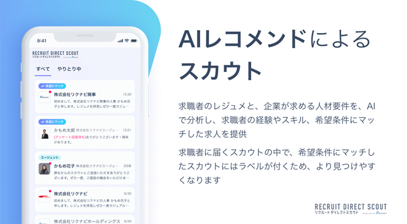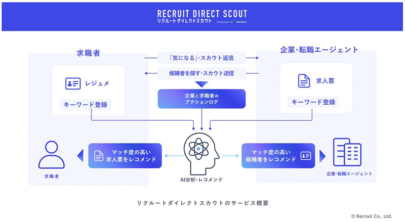 株式会社リクルート(本社:東京都千代田区、代表取締役社長:北村 吉弘、以下リクルート)は、2023年12月4日(月)より会員制転職スカウトサービス『リクルートダイレクトスカウト』をリニューアルします。各種機能の全面的な刷新と、AIによるレコメンド機能を導入し、求職者の方がより使いやすく、自分にマッチしたスカウトが届くサービスへ生まれ変わります。人材紹介事業『リクルートエージェント』の運営を通じて、40年以上にわたって蓄積されてきた転職支援の知見と膨大なデータをAI技術に生かし、求職者と企業双方が、よりダイレクトに、シンプルに、カジュアルに出会い、より良いマッチングにつながるサービスを目指します。