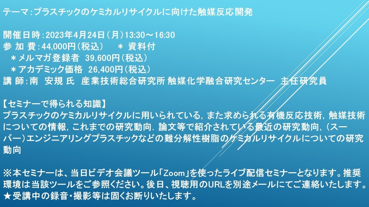 先端技術情報や市場情報を提供している(株)シーエムシー・リサーチ(千代田区神田錦町: https://cmcre.com/ )では、 各種材料・化学品などの市場動向・技術動向のセミナーや書籍発行を行っておりますが、 このたび「プラスチックのケミカルリサイクルに向けた触媒反応開発」と題するセミナーを、 講師に南 安規 氏 (産業技術総合研究所 触媒化学融合研究センター 主任研究員)をお迎えし、2023年4月24日(月)13:30より、 ZOOMを利用したライブ配信で開催いたします。 受講料は、 一般:44,000円(税込)、 弊社メルマガ会員:39,600円(税込)、 アカデミック価格は26,400円(税込)となっております(資料付)。