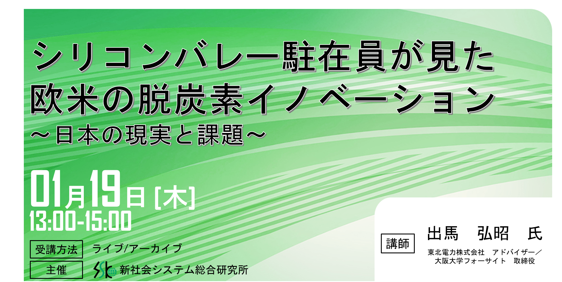 「シリコンバレー駐在員が見た欧米脱炭素イノベーション」と題して東北電力株式会社 出馬 弘昭氏のセミナーを2023年1月19日(木)に開催!!