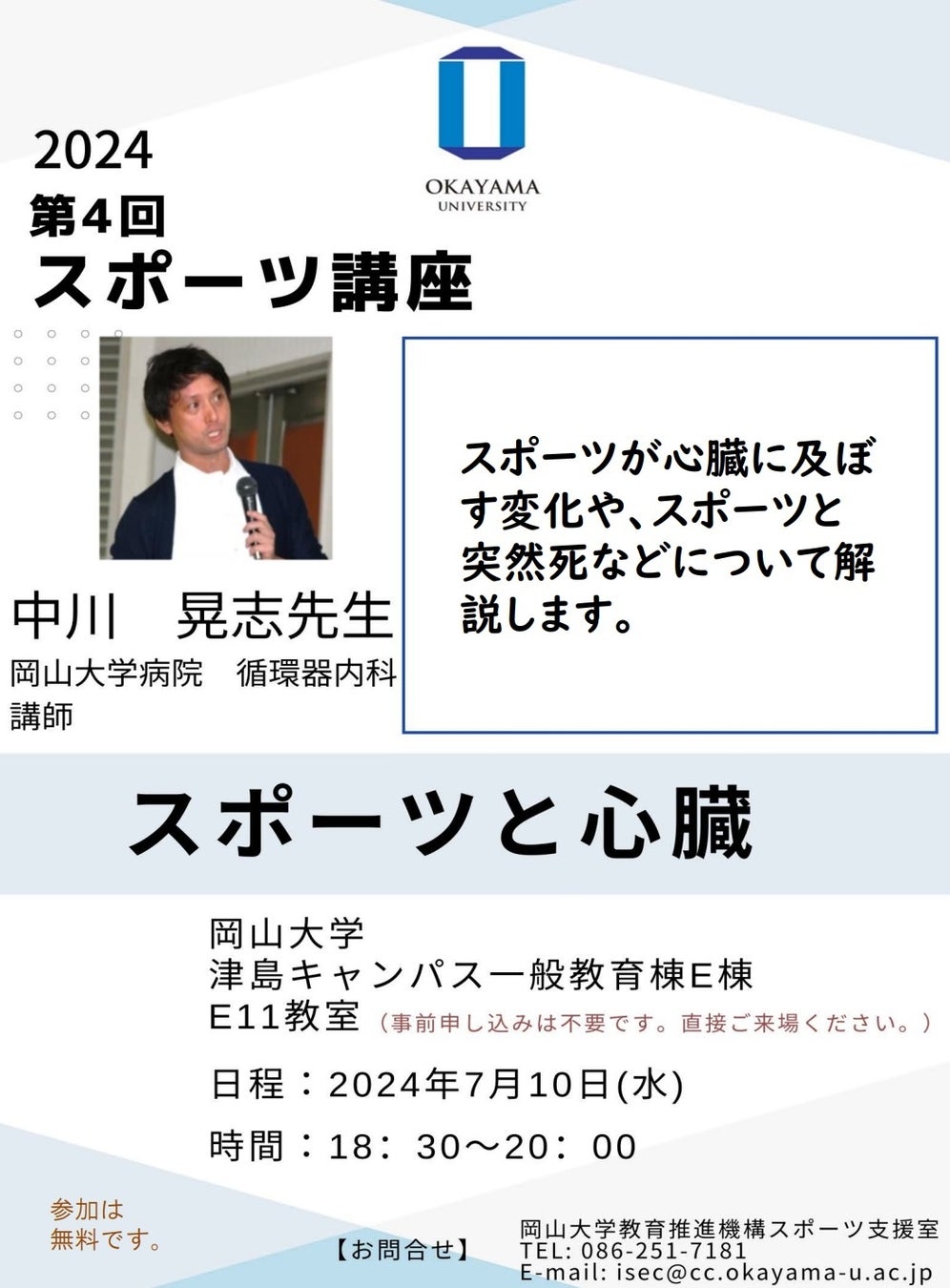【岡山大学】2024年度岡山大学第4回スポーツ講座「スポーツと心臓」〔7/10,水 岡山大学津島キャンパス〕