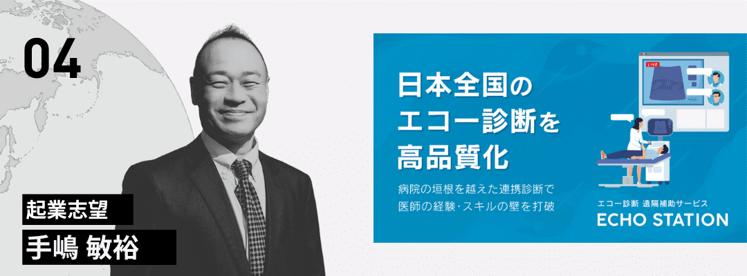超音波検査(エコー)のエキスパートと初心者を繋ぎ、一人で診断に困っている医師をwebカメラで助けるプロダクト。夜間でもいつでも全国のエキスパート医師とマッチングでつなぎ患者を救う。