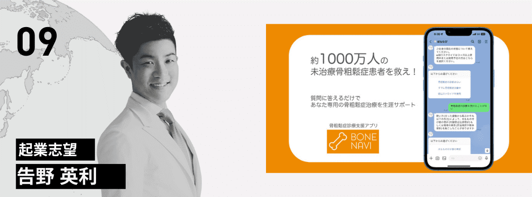 2018年、浜松医科大学医学部卒業。整形外科医。日本赤十字社愛知医療センター名古屋第二病院、名古屋大学医学部附属病院で勤務したのち、現在は八千代病院で勤務している。診療を通じて、多くの骨粗鬆症患者さん達が苦しんでいるのを目の当たりにして、根本解決を目指し、啓発活動を行っている。