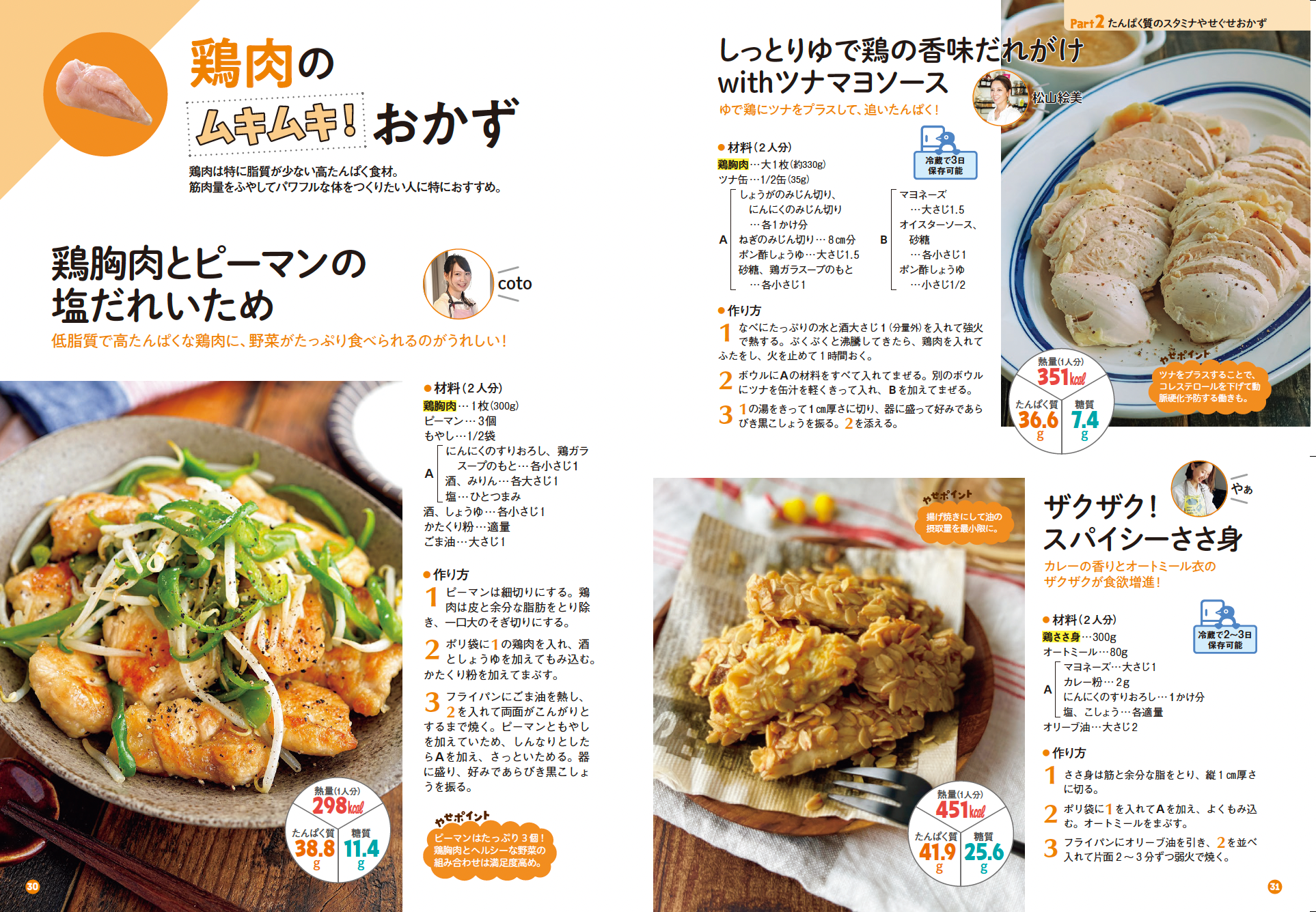 代表的な鶏料理はもちろん、豚肉やひき肉、大豆加工食品まで網羅。かさまししたり、野菜と組み合わせたり、おからやオートミールをつなぎや衣に使ったりと、人気Nadia Artistがあらゆる手を尽くし、バラエティに富んだ「高たんぱくレシピ」を提案します。