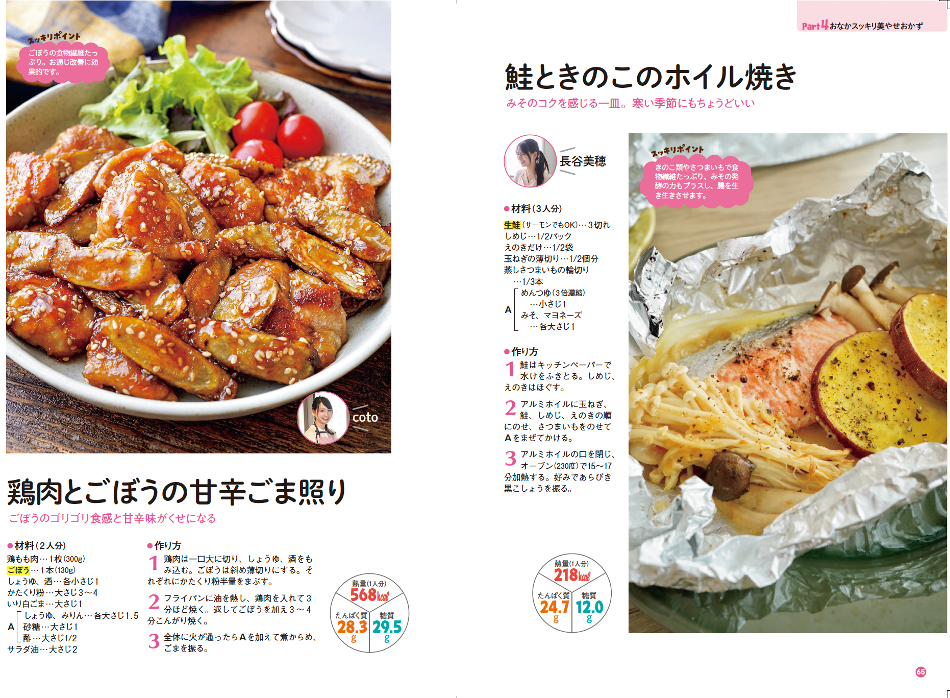 小鉢やスープだけと思いきや、ごぼうやきのこをたっぷり使ったメインのおかずや、作りおきしておけるレシピまで幅広くお届け。美しさもランクアップしてやせたいなら必見です!