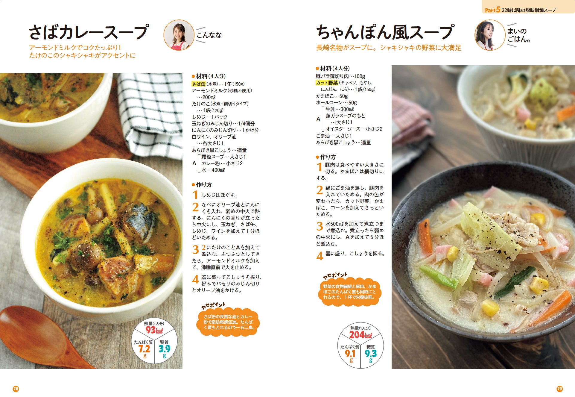 話題となったトマトベースの脂肪燃焼スープのほか、辛味たっぷり韓国風スープなど具沢山で満足感のあるレシピを掲載。