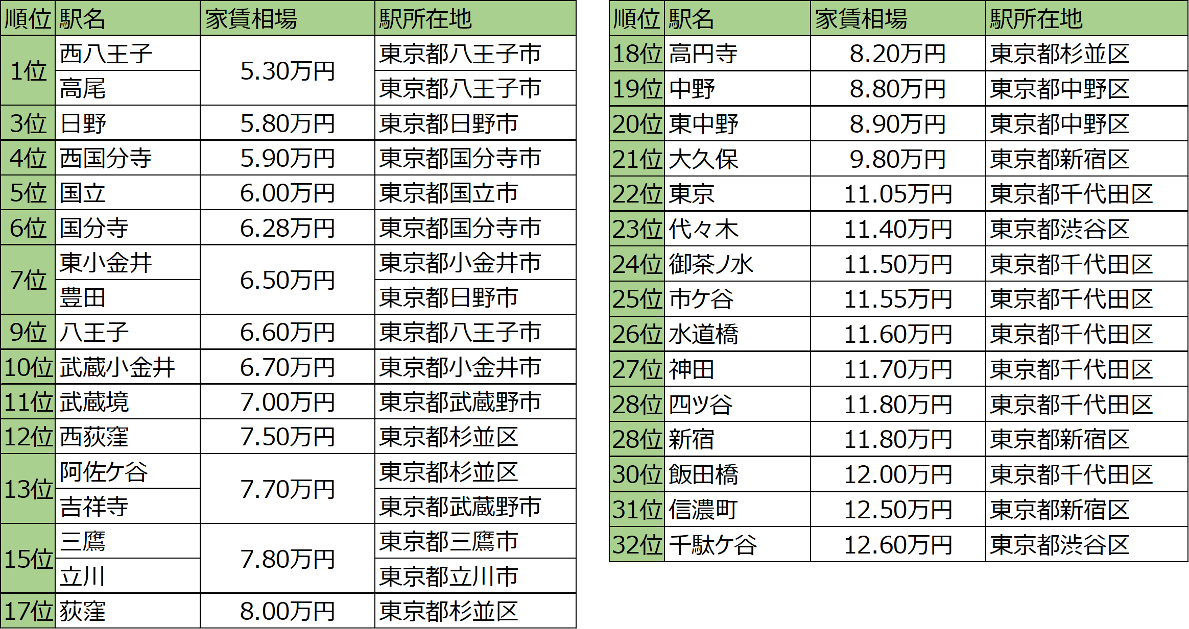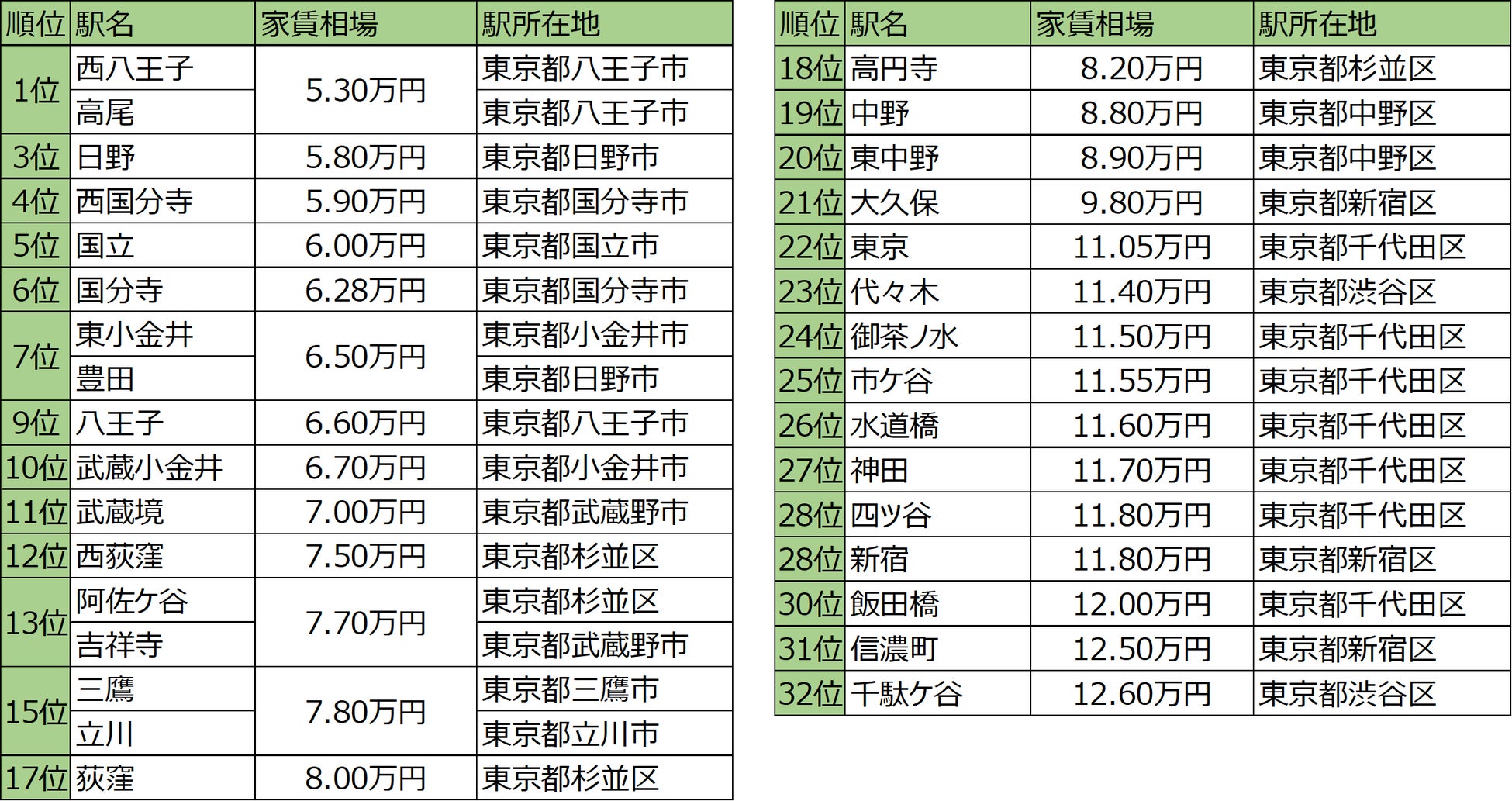 都内にあるJR中央線の駅では最西端にあたる1位高尾駅の近隣に位置する駅は、家賃相場がおおむね5万円台~6万円台に収まっています。しかし3位日野駅(家賃相場5万8000円)と5位国立駅(同6万円)の間に位置する立川駅は家賃相場が7万8000円と突出して高く、15位にランクインしました。