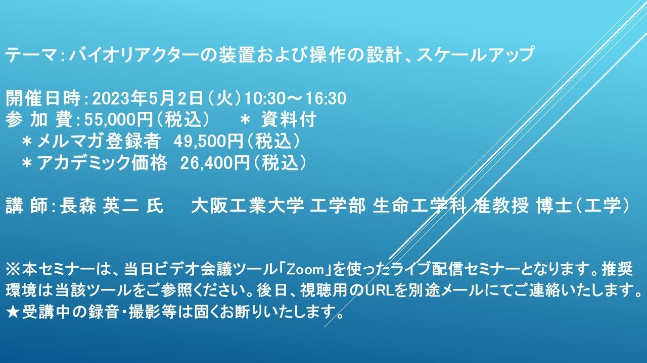 先端技術情報や市場情報を提供している(株)シーエムシー・リサーチ(千代田区神田錦町: https://cmcre.com/ )では、 各種材料・化学品などの市場動向・技術動向のセミナーや書籍発行を行っておりますが、 このたび「バイオリアクターの装置および操作の設計、スケールアップ」と題するセミナーを、 講師に長森 英二 氏 (大阪工業大学 工学部 生命工学科 准教授 博士(工学))をお迎えし、2023年5月2日(火)10:30より、 ZOOMを利用したライブ配信で開催いたします。 受講料は、 一般:55,000円(税込)、 弊社メルマガ会員:49,500円(税込)、 アカデミック価格は26,400円(税込)となっております(資料付)。