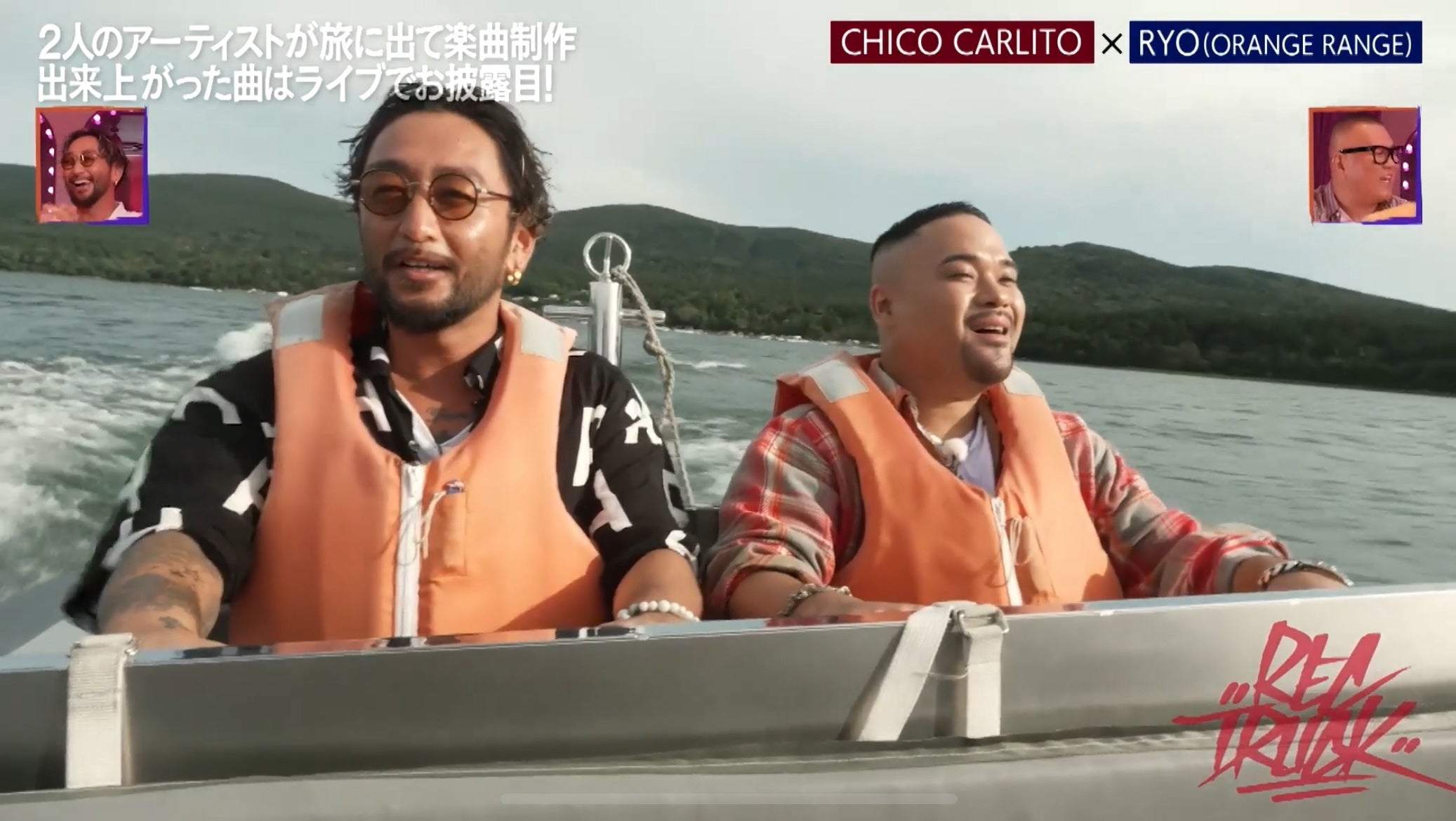 第一弾では、共に沖縄出身のラッパー・CHICO CARLITOと、ロックバンド・ORANGE RANGEのRYOが静岡県・山中湖へ。向かう道中では楽曲のビートやテーマを決め、富士山を望む山中湖畔の絶景の中でボートやグランピング、BBQを堪能しました。