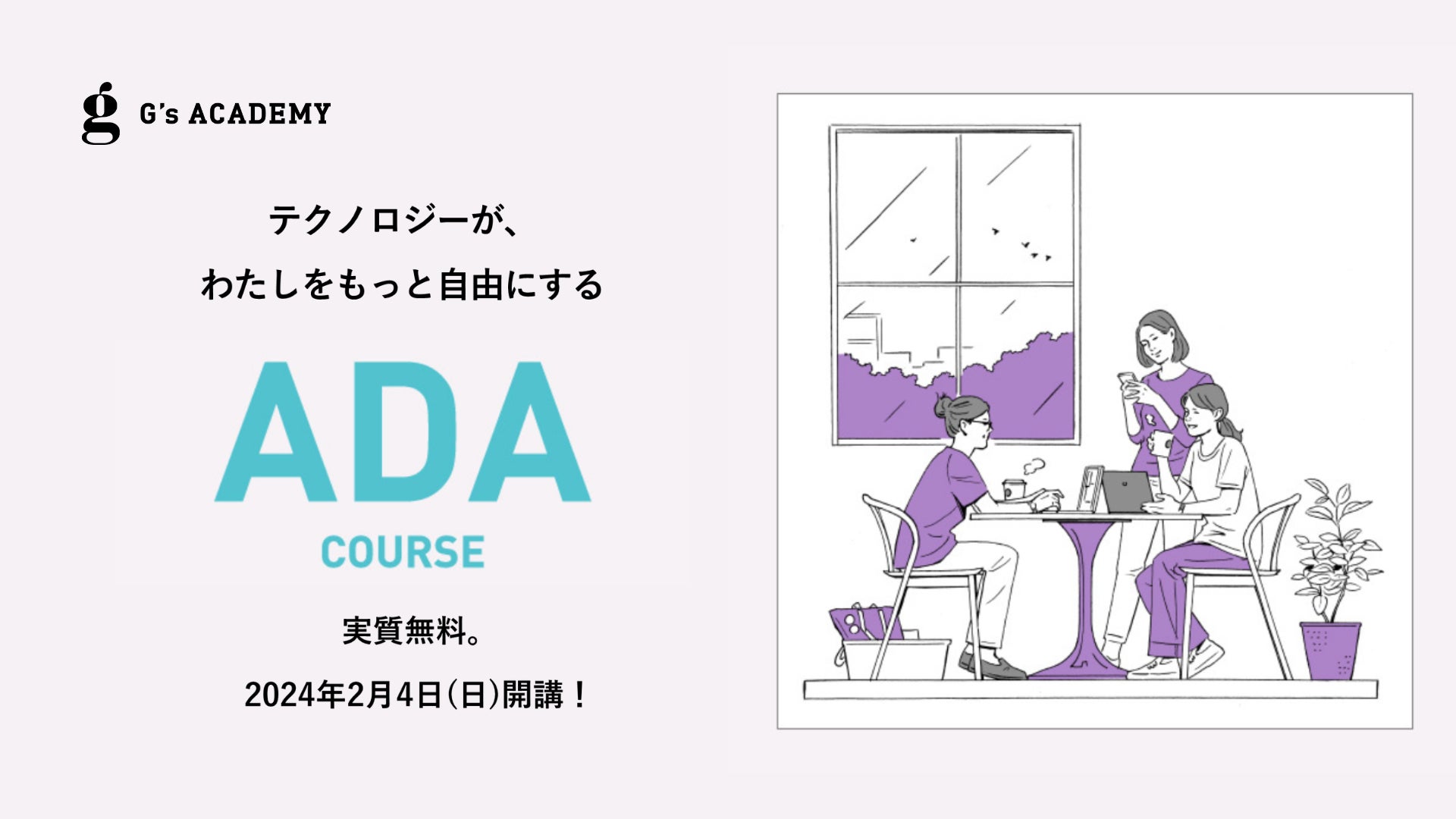 ジーズアカデミーは、そんな女性ならではの観点・アイデアで生み出される事業やプロダクトこそ、これからのセカイを変える一翼になると考え、女性専用プログラム「ADAコース」(読み方:エイダコース)を新たに開講します。アイデアを事業という形に落とし込む「事業企画」の力と、アイデアを自らの手で形にできる「プログラミング」、2つの武器を使いこなす力を身に付け、女性起業家の育成・輩出・サポートを一気通貫で支援します。