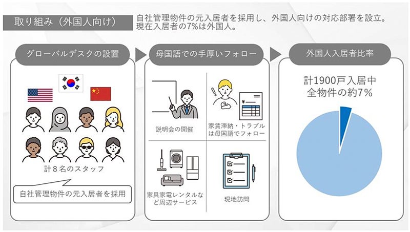 高齢者や外国籍の方など入居希望者を断らないスタンスで各種サポートサービスを提供