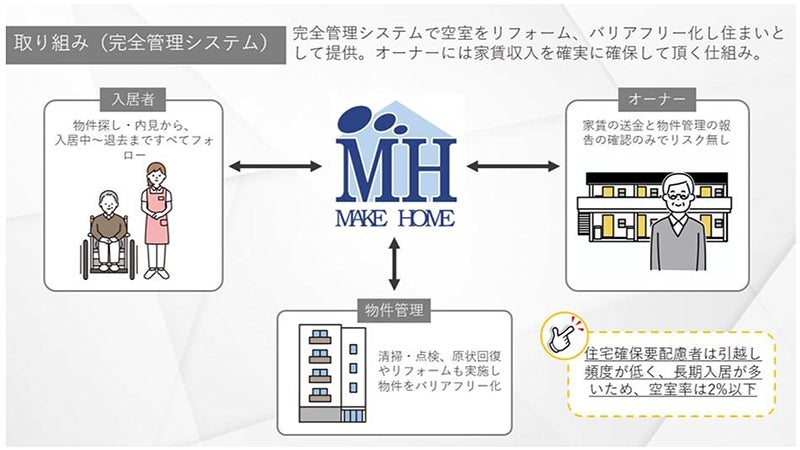 高齢者や低所得者、精神障がいのある人や車椅子の人など、住まい探しが困難な人たちへのサービスに特化したメイクホーム。社長自身や従業員・家族に障がいのある人も多く、住まい探しから保証人対応、物件の改修、病院付き添いまでさまざまなサービスを提供中。特徴的なスキームは『完全管理システム』。築古などで空室になっているアパートを、投資家から預かった資金でリフォームして住まいを必要としている人に提供。トラブルなどは全てノウハウのある同社が対応することで、オーナーの不安やリスクを排除し、安定的・長期的な家賃収入を還元。「いつでも・どこでも・どんな理由でも、何か連絡があったら、断らずに必ず駆けつける」。目指すのは「救急総合病院」のような存在。不動産業ではなく、福祉や生活支援、介護・看護や見守り等も含めたトータルサポートを全国へと広げていく。