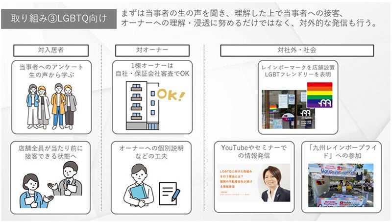 外国人や高齢者、LGBTQ、DV被害者、被災者など、抱える問題や事情に違いはあれど、「すべての人に快適な住環境の提供をしたい」という基本姿勢の下、さまざまなニーズにいち早く応えてきた。「身寄りがない」「高齢だから」などの理由で通常の契約が困難なケースに対応するため、NPO法人を自社で設立し、オーナーと高齢者の間に入って住宅を転貸。また、留学生の急増に伴い、外国人従業員を採用し、外国人入居者を積極的に受け入れ、定期巡回による見守りや生活のサポートを実施している。さらに、LGBTQの方向けには、LGBTQの人たちが抱える悩み事や問題点を把握するため、社内研修会や勉強会を企画・開催。社外向けの発信機会も増え、行政や異業種ともタッグを組みながら活動を広げている。