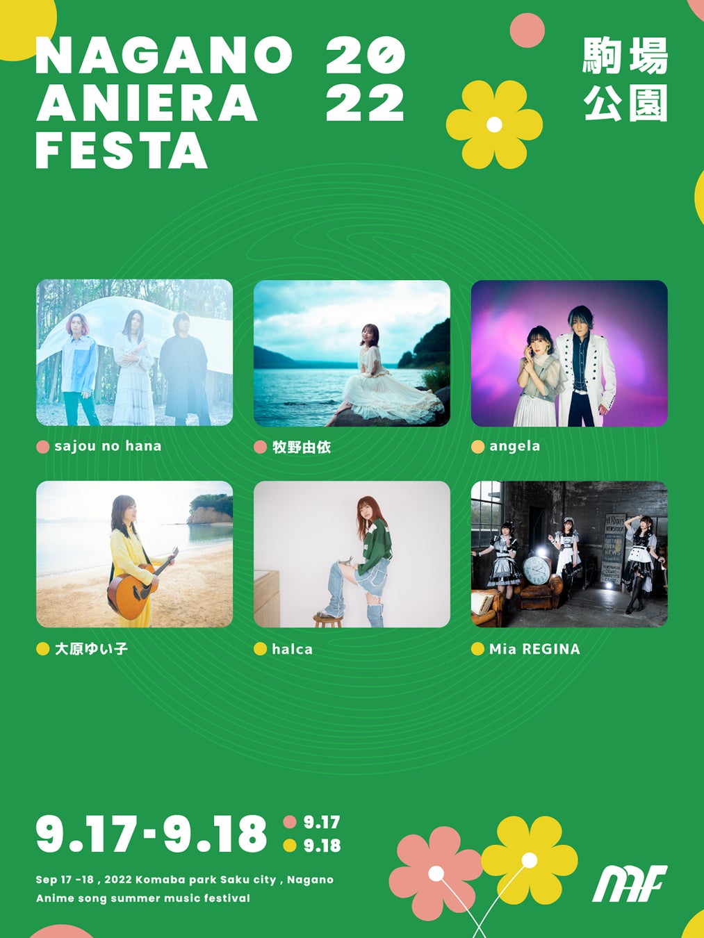 そして新たに、TVアニメ「プリパラ」シリーズや「アイドルマスター シンデレラガールズ」など、人気作品の声優を務め、アーティストとしても活躍し2019年以来2度目の出演となる牧野由依、TVアニメ「モブサイコ100 Ⅱ」のOPテーマ『99.9』やEDテーマ『メモセピア』などが話題となり、8月24日にリリースする『天灯』がTVアニメ「ダンジョンに出会いを求めるのは間違っているだろうかⅣ 新章 迷宮篇」OPテーマに起用されるなど注目のアーティスト・sajou no hanaが9月17日(土)に出演決定。翌18日(日)は、人気TVアニメの主題歌を担当し今注目の本格派アニソンボーカルユニットMia REGINA、8月にニューシングルのリリースを控え9月には7th LIVE 『Help Me!!!!!!! & live playground #003』が決まった人気のニューフェイス・halcaが昨年よりリベンジ出演を果たします。さらに、現在大ヒット上映中の劇場版「からかい上手の高木さん」主題歌を務める大原ゆい子、TVアニメ「蒼穹のファフナー』、「K」、「シドニアの騎士」、「乙女ゲームの破滅フラグしかない悪役令嬢に転生してしまった…」などの大人気アニメを数々の名曲で盛上げてきたアニソンファンの絶対的存在であるangelaのナガノアニエラフェスタ初出演が決定! 野外アニソンフェスでしか見ることできないアーティストたちの姿をぜひご覧ください。