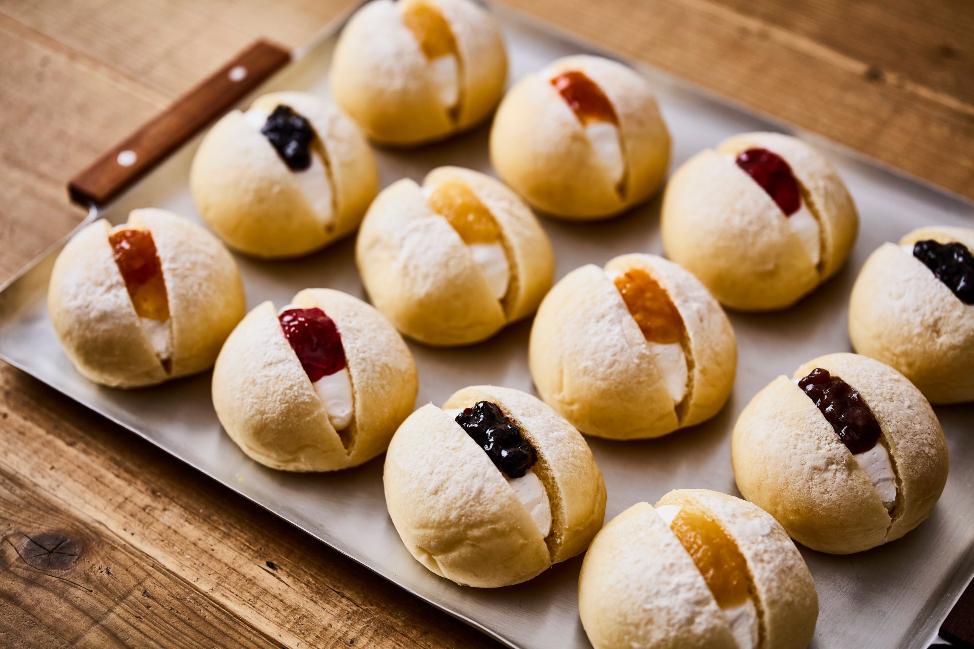 生食専用の「パン ド ミ アンジュ」を使用した店舗限定パンです。北海道産ゆめちからを100%使ったしっとりとした生地に、大阪の手作りジャムブランド「メルカートピッコロ」のジャムをたっぷりと入れました。フレーバーはトウモロコシ、カシス、あまおう苺、ブラッドオレンジ、フルーツミックスようなの5種類で、生地のほんのり甘い風味とジャムの味わいが絶妙にマッチする、ここだけで楽しめる限定パンです。