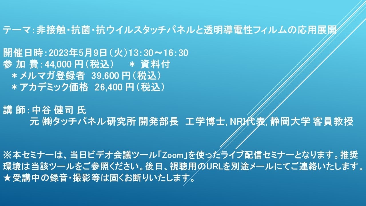 先端技術情報や市場情報を提供している(株)シーエムシー・リサーチ(千代田区神田錦町: https://cmcre.com/ )では、 各種材料・化学品などの市場動向・技術動向のセミナーや書籍発行を行っておりますが、 このたび「非接触・抗菌・抗ウイルスタッチパネルと透明導電性フィルムの応用展開」と題するセミナーを、 講師に中谷 健司 氏 (元 (株)タッチパネル研究所 開発部長 工学博士, NRI代表, 静岡大学 客員教授)をお迎えし、2023年5月9日(火)13:30より、 ZOOMを利用したライブ配信で開催いたします。 受講料は、 一般:44,000円(税込)、 弊社メルマガ会員:39,600円(税込)、 アカデミック価格は26,400円(税込)となっております(資料付)。
