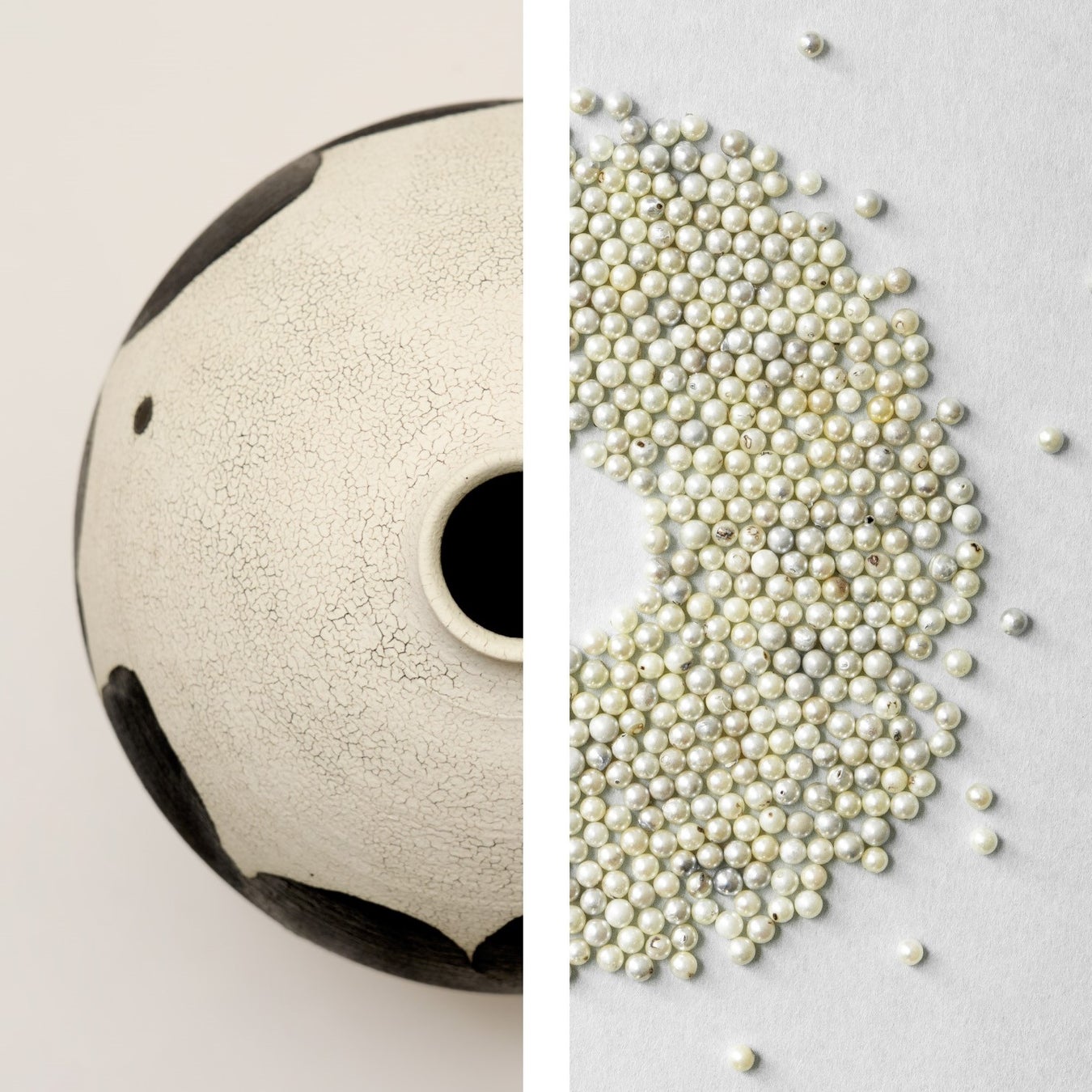 また野口寛斉は人気の湯呑みのほか、今回のために特別にテーブルウェアを制作。伝統文化にSDGsの観点を取り入れ、ジュエリーになれず廃棄される真珠を作品に織り交ぜた大皿が登場します。