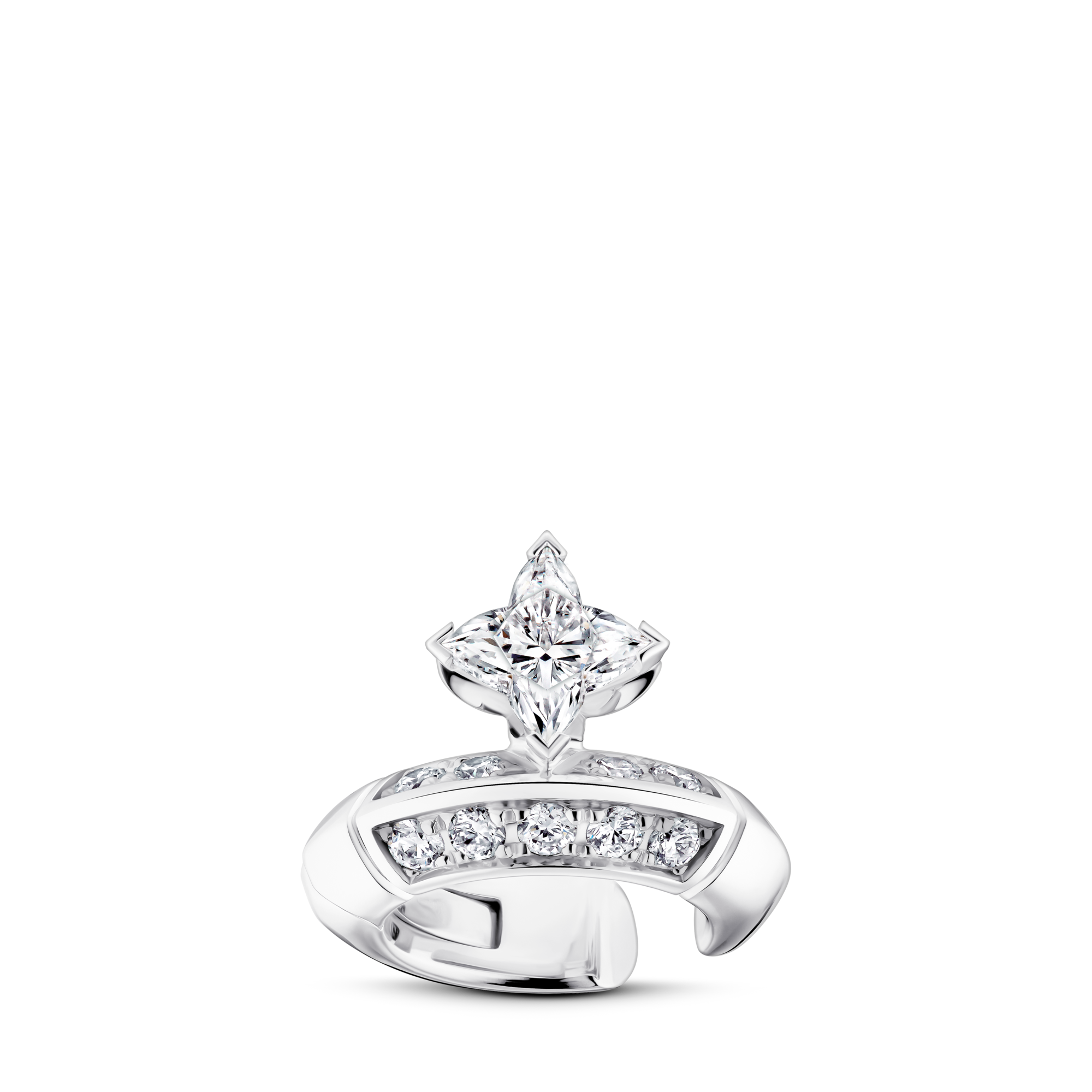 「LV ダイヤモンド」コレクションでは、数年にもおよぶ研究開発を要した独自のダイヤモンドカットも目を引きます。このLV モノグラムスターカットは、1896年にガストンールイ·ヴィトンのデザインにより誕生したモノグラムの、最もプレシャスな解釈と言え、ダイヤモンドの輝きを高めながら完璧なシンメトリーを描くそれぞれの花弁のきらめき、ボリューム、そして奥深さが際立ちます。ダイヤモンドにこのような燦然としたモダニティを吹き込むには、真に卓越した原石が必要ですが、高度な技術力を鮮やかに示すこの試みにおいては、従来のブリリアントカットダイヤモンドが57面であるのに対し、53面からなるダイヤモンドのファセットの配置が入念に検討され、1つ1つを手仕事でカットして研磨することで、最大限の光を捉えることに成功しています。